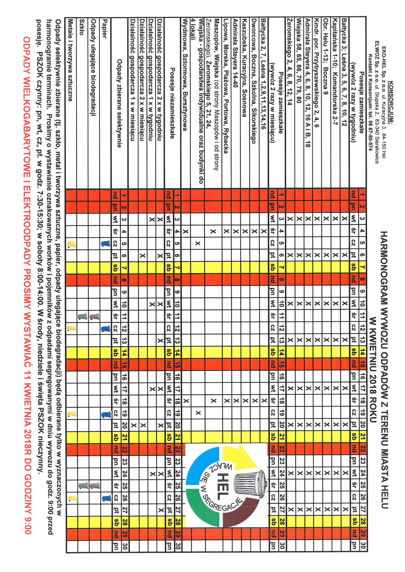 2018.04 - harmonogram wywozu odpadów komunalnych z terenu miasta Helu w kwietniu 2018 r.