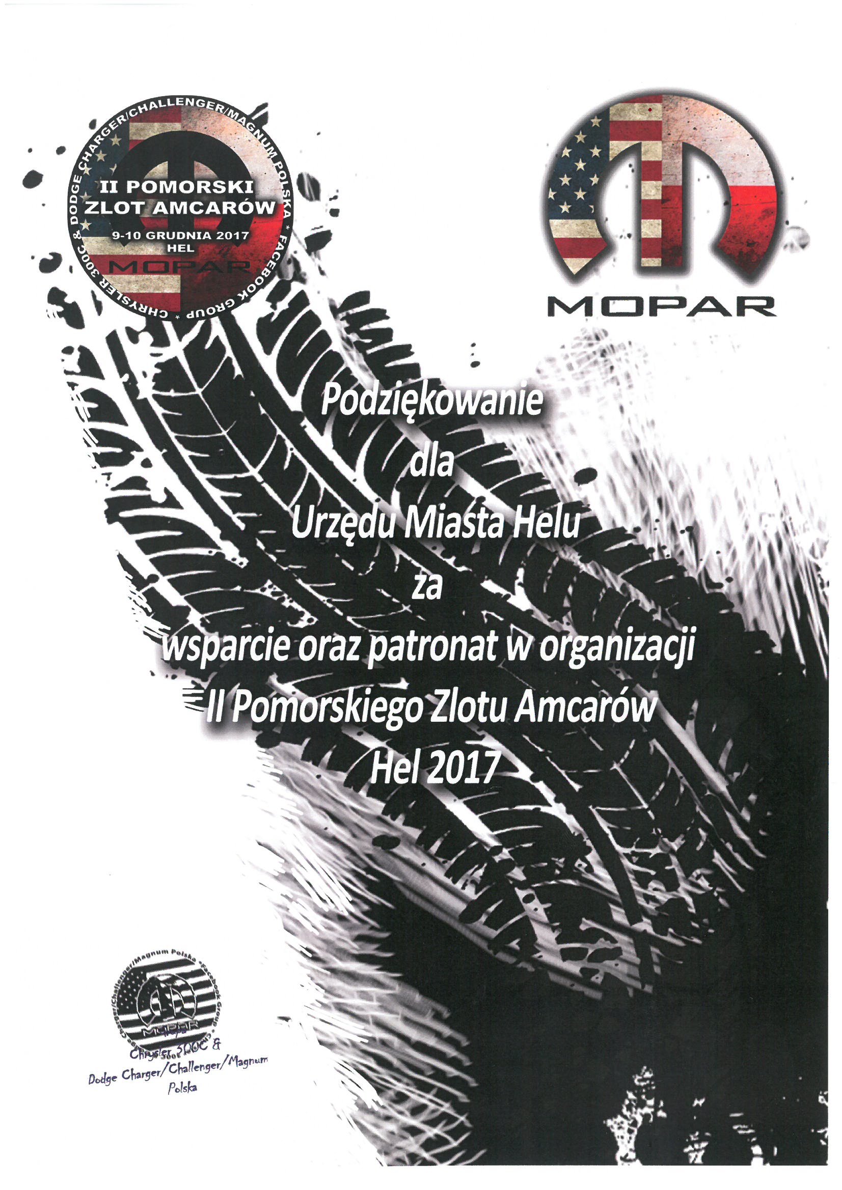 Podziękowanie dla Urzędu Miasta Helu za wsparcie oraz patronat w organizacji II Pomorskiego Zlotu Amcarów - 2017