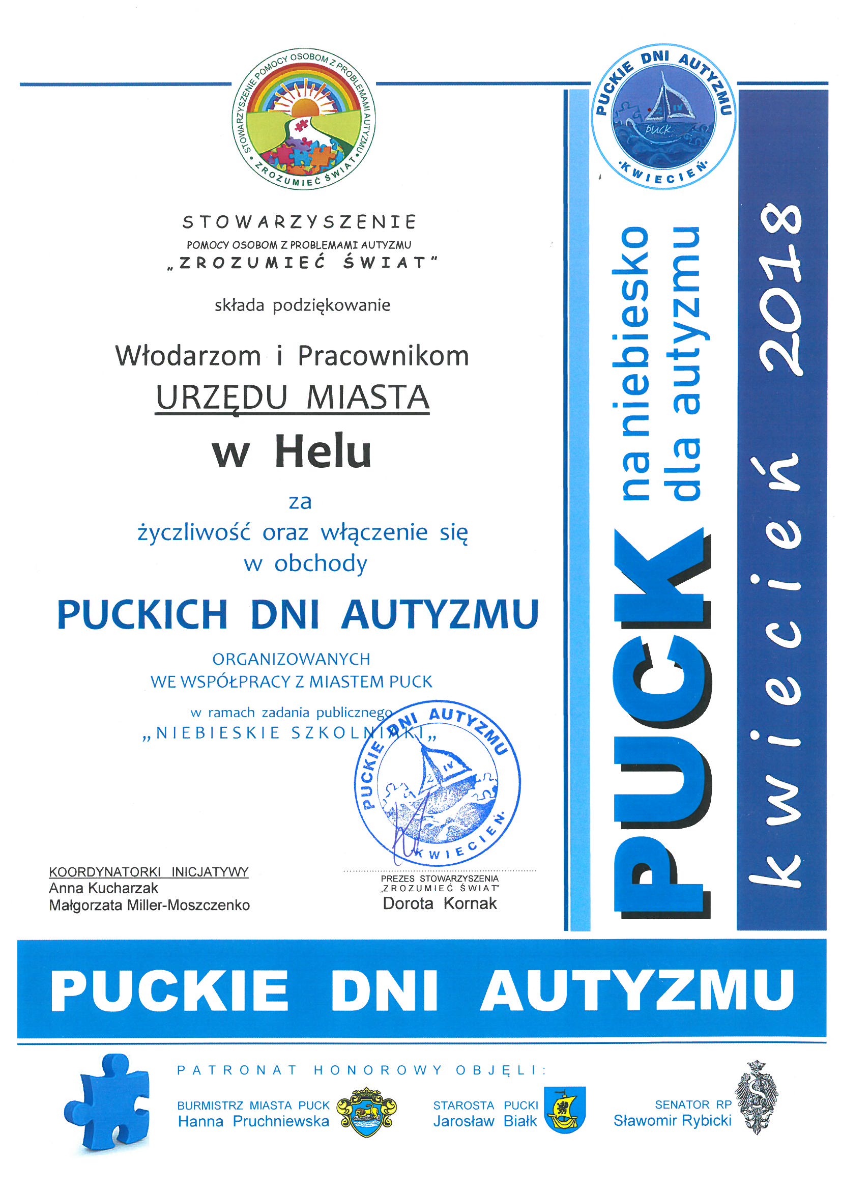Stowarzyszenie Pomocy z Problemami Autyzmu "Zrozumiec Świat" składa podzięwanie Włodarzom i Pracownikom Urzędu Miasta za życzliwość oraz właczenie się w obchody Puckich Dni Autyzmu