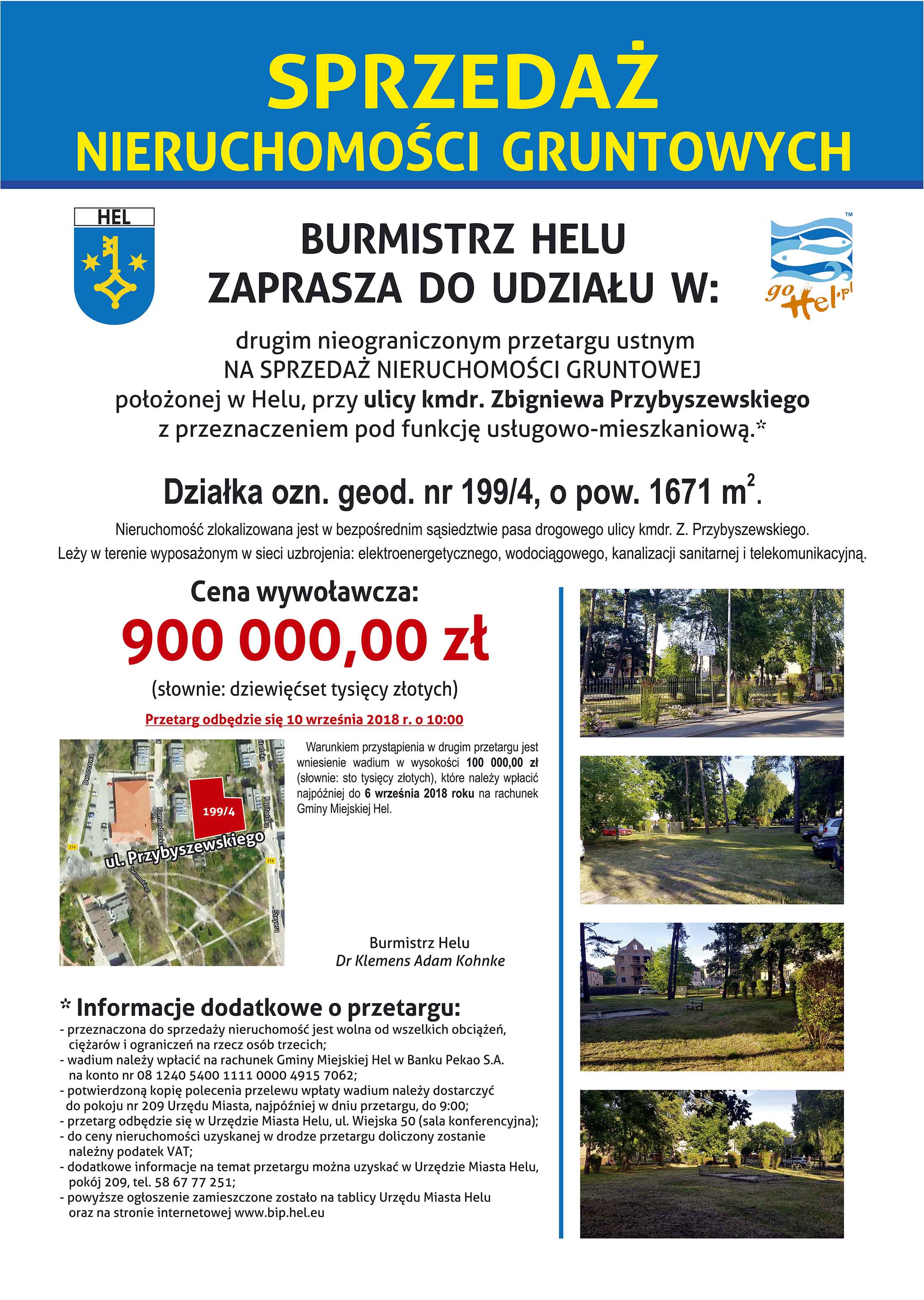 PLAKAT - Informacje dodatkowe o drugim nieograniczonym przetargu ustnym na sprzedaż nieruchomości gruntowej niezabudowanej, położonej w Helu, przy ulicy Przybyszewskiego o powierzchni 1671 m2
