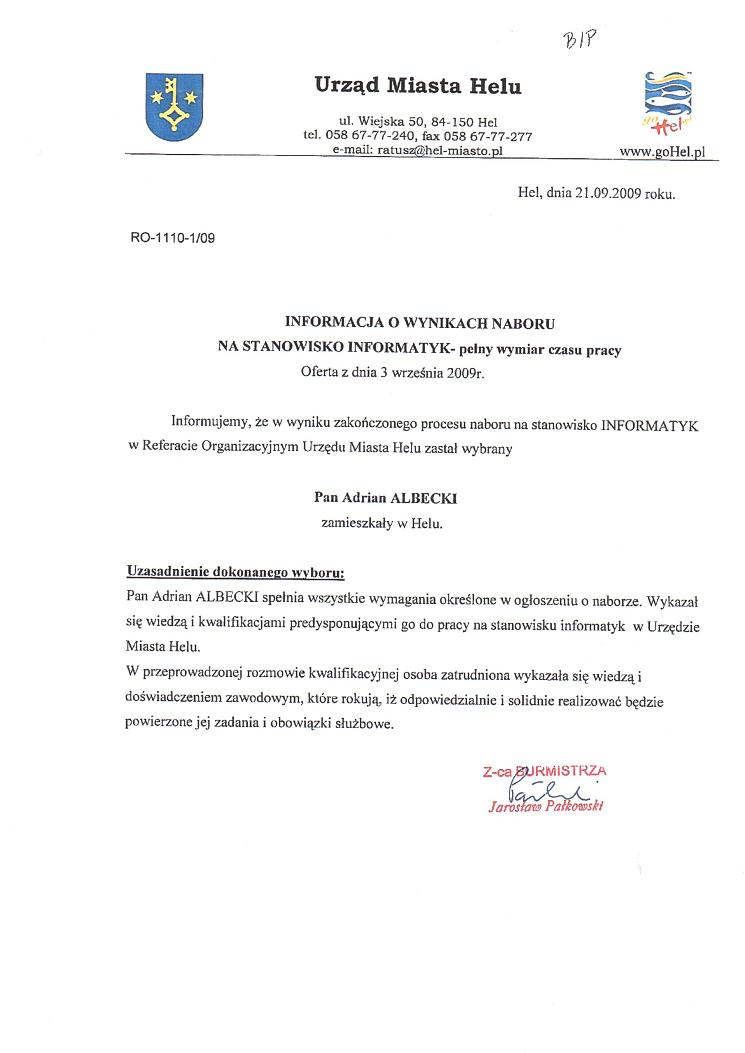Pan Adrian ALBECKI spełnia wszystkie wymagania określone w ogłoszeniu o naborze. Wykazał się wiedzą i kwalifikacjami predysponującymi go do pracy na stanowisku informatyk w Urzędzie Miasta Helu.