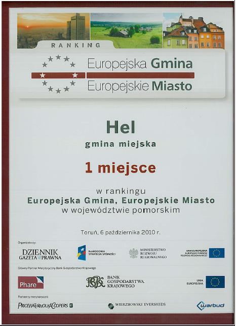 W dniu 6 października 2010 roku w Toruniu burmistrz Helu Mirosław Wądołowski odebrał certyfikat zdobycia 1 miejsca dotyczącego rankingu EUROPEJSKA GMINA - EUROPEJSKIE MIASTO w województwie pomorskim.