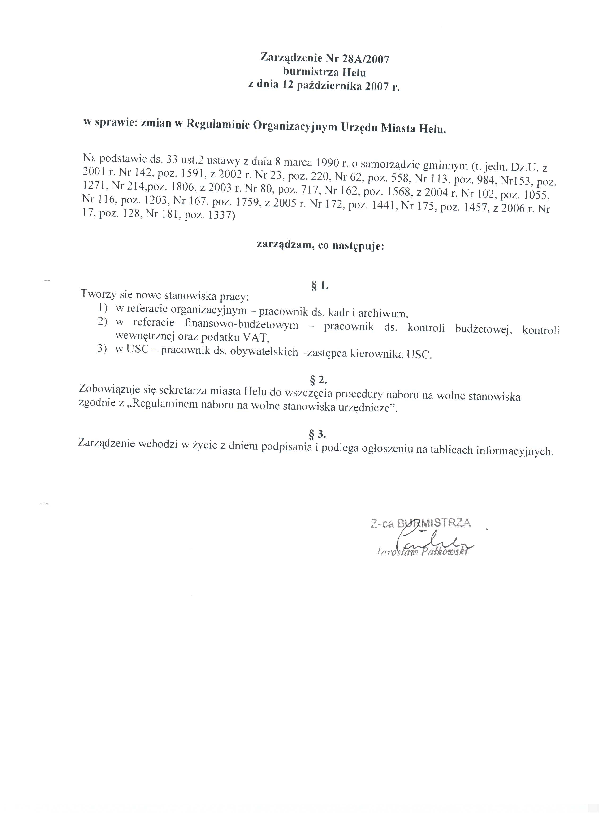 - nowe stanowisko pracy - informatyka. - Zarządzenie nr 28a/2007 Burmistrza Helu z dnia 12.10.2007 r. w sprawie zmian w Regulaminu Organizacyjnego UM Helu