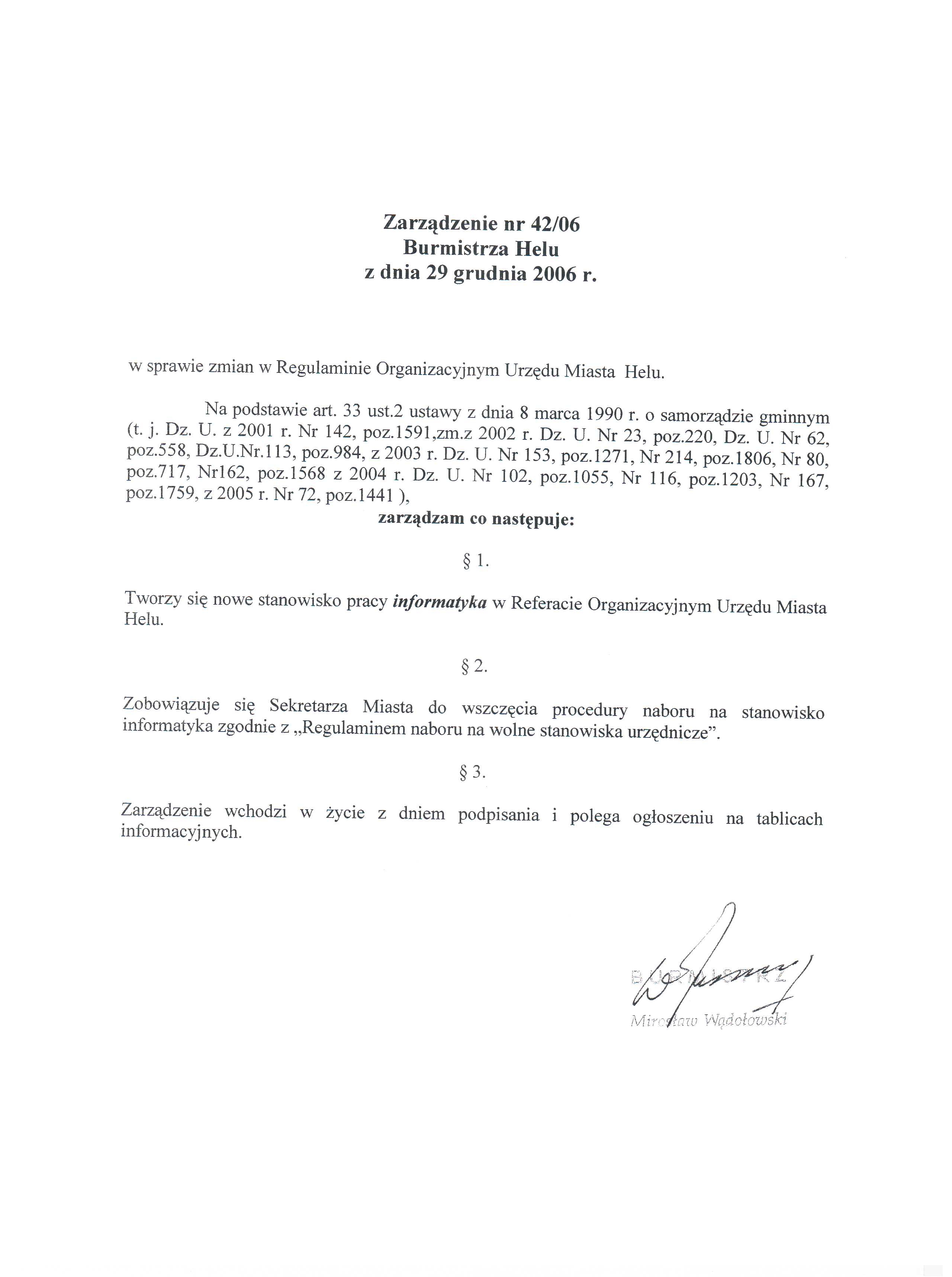 - Zarządzenie nr 42/06 Burmistrza Helu z dnia 29.12.2006 r. w sprawie zmian Regulaminu Organizacyjnego UM Helu