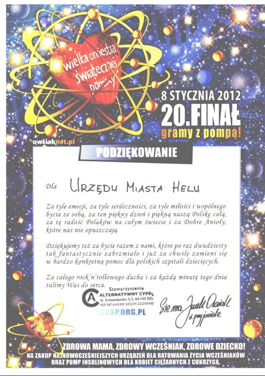Podziękowanie dla Urzędu Miasta Helu za wsparcie Wielkiej Orkiestry Świątecznej Pomocy w 2012 roku.