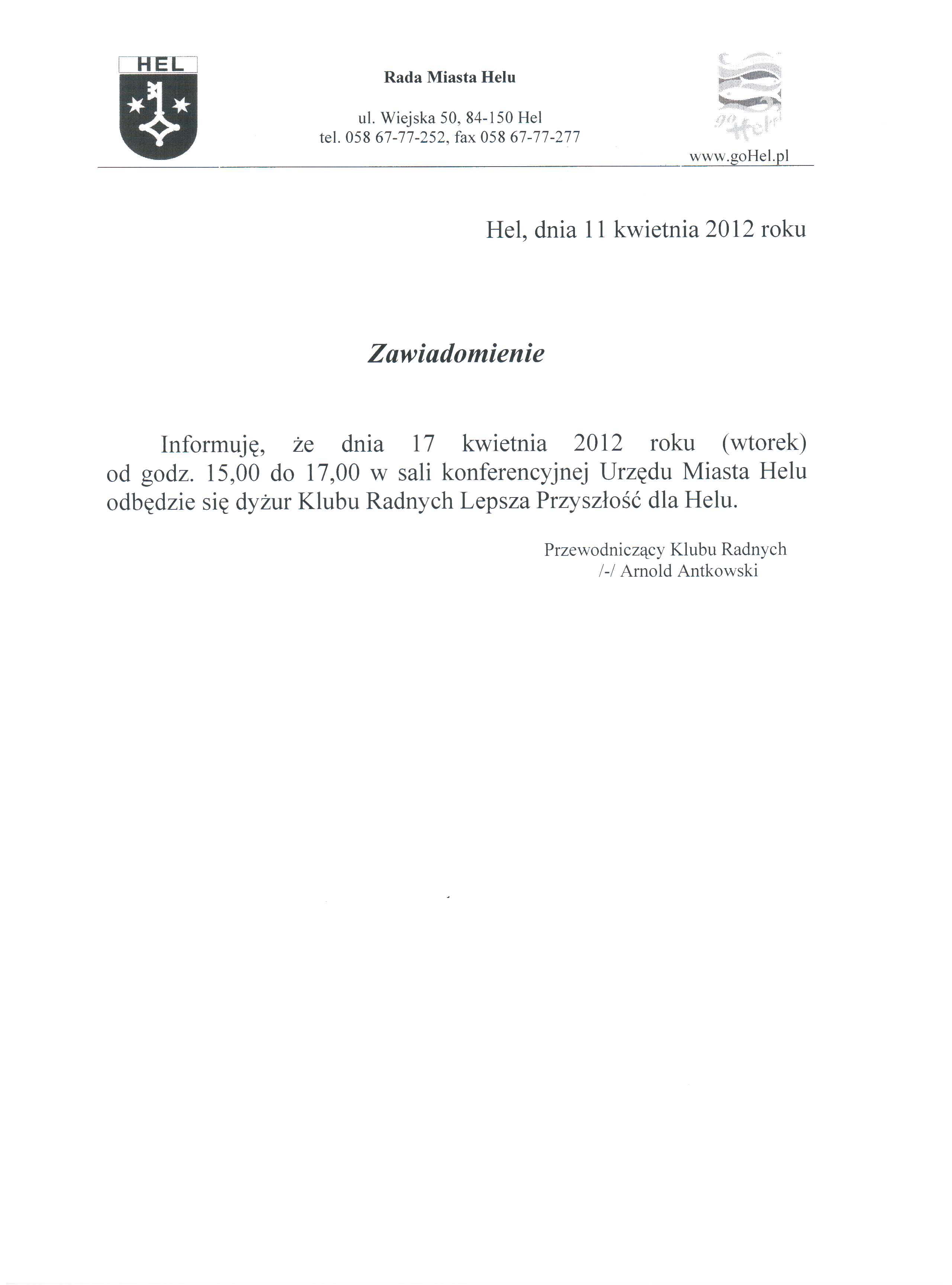 W załączniku znajduje się informacja o terminie dyżuru Klubu Radnych Lepsza Przyszłość dla Helu.