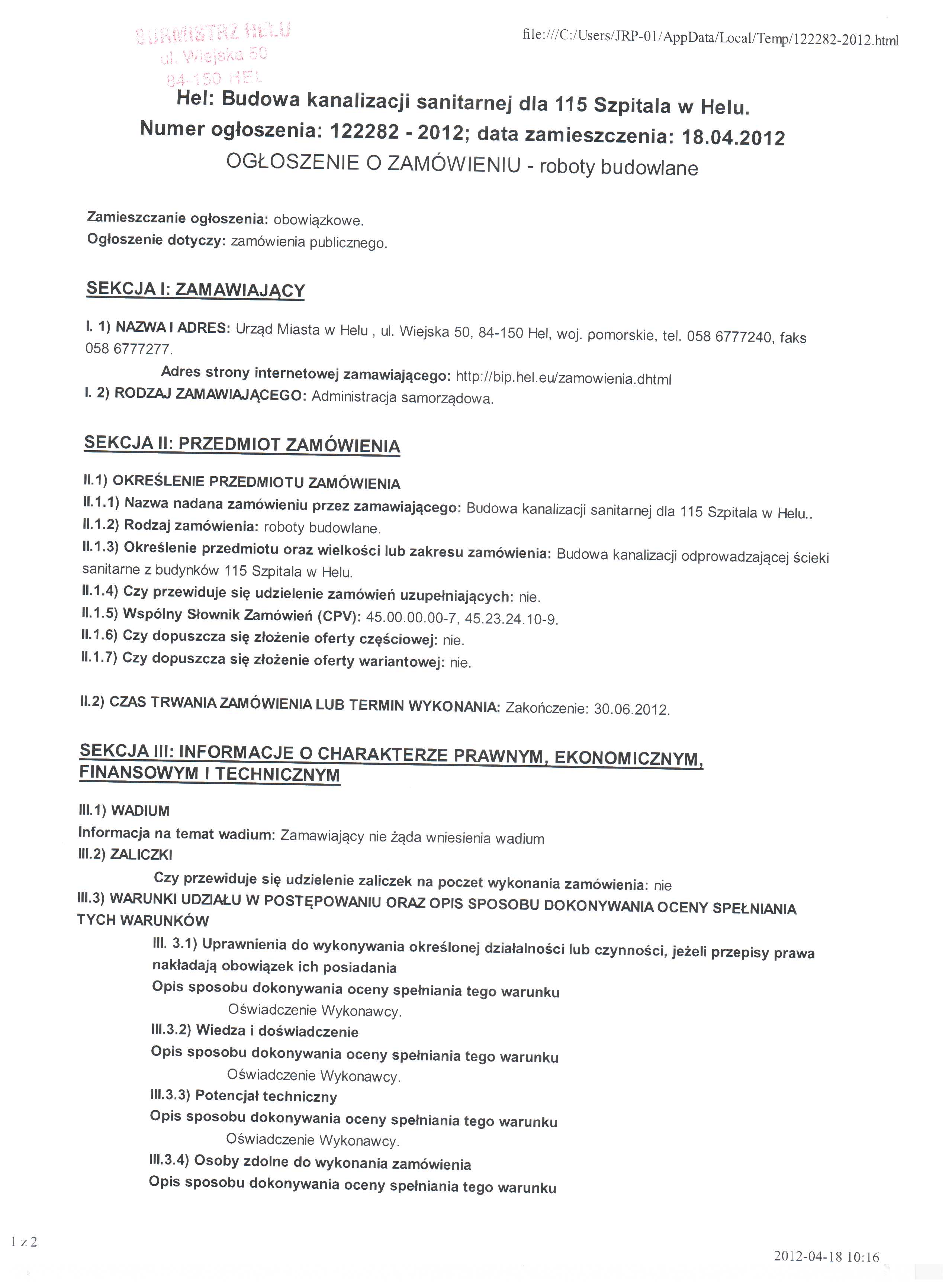 W poniższym linku znajduje się ogłoszenie: Budowa kanalizacji sanitarnej dla 115 Szpitala w Helu.