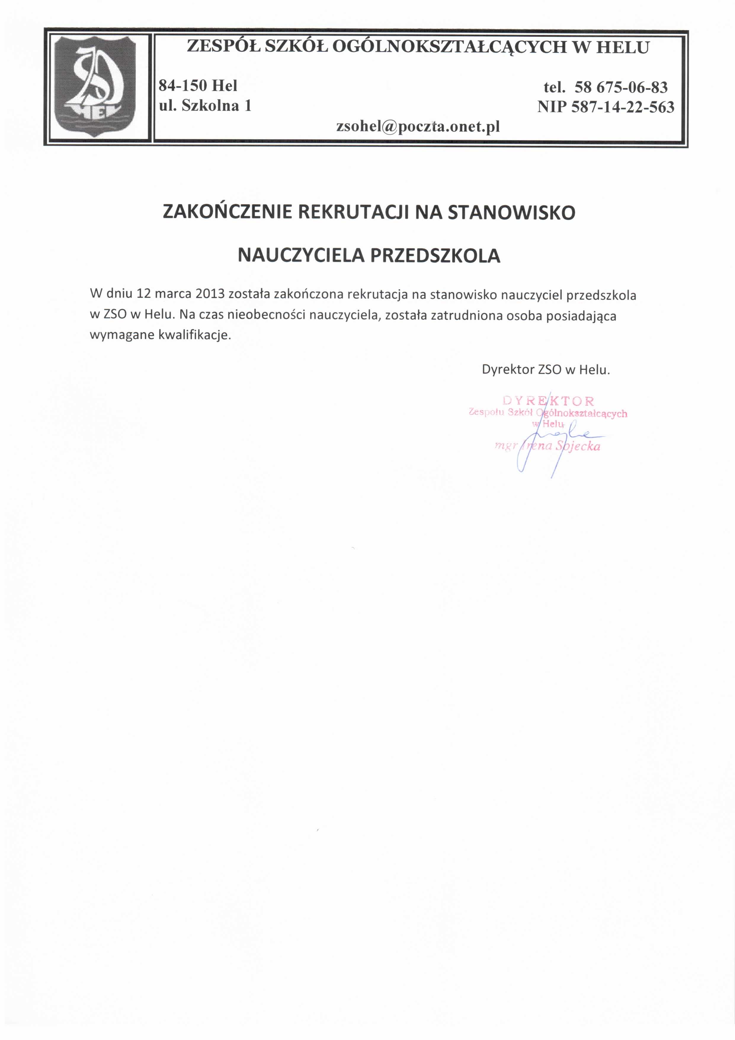 W dniu 12 marca 2013 została zakończona rekrutacja na stanowisko nauczyciel przedszkola w ZSO w Helu. Na czas nieobecności nauczyciela, została zatrudniona osoba posiadająca wymagane kwalifikacje.