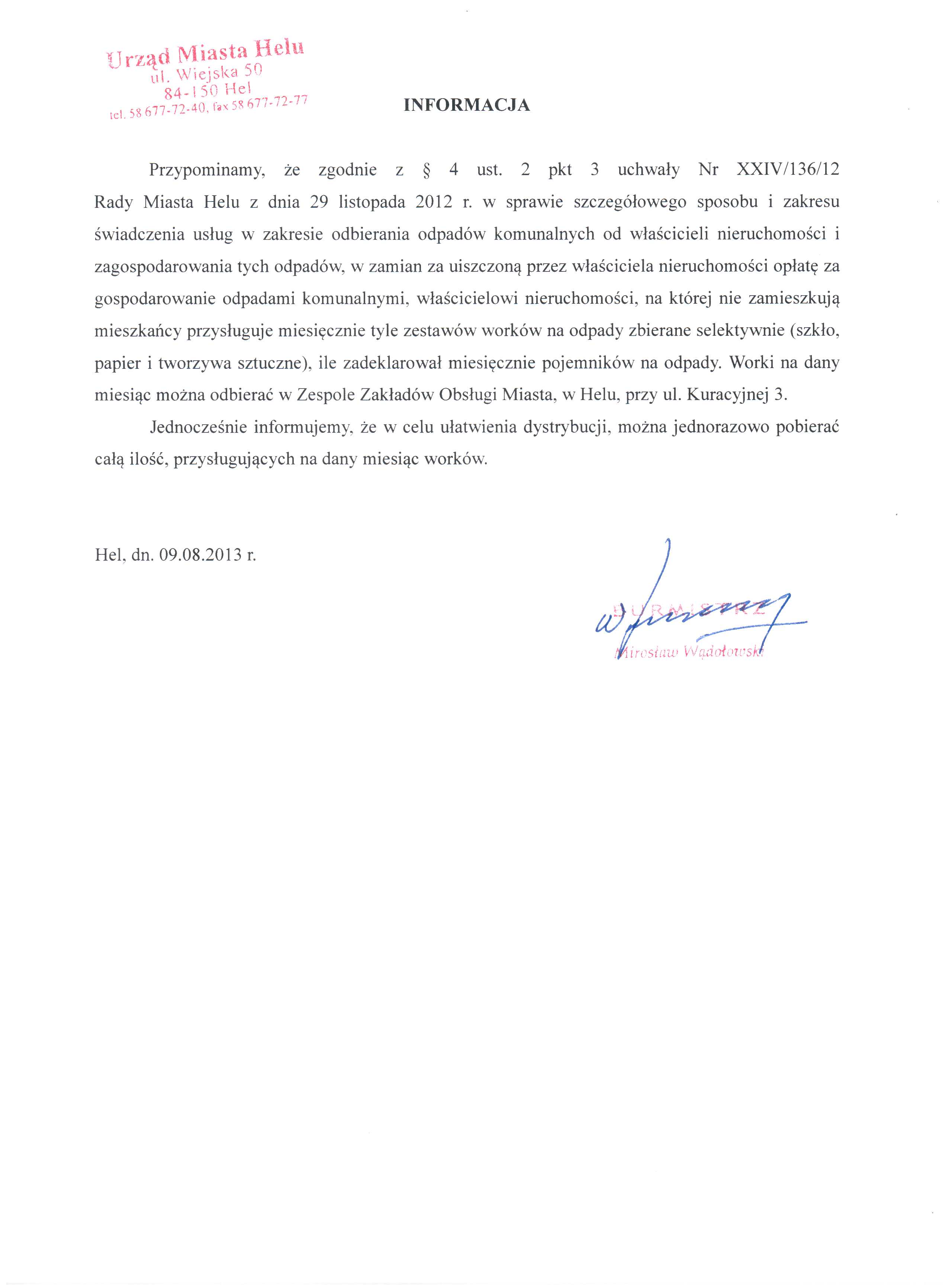Informacja burmistrza Helu dotycząca dystrybucji worków na odpady.