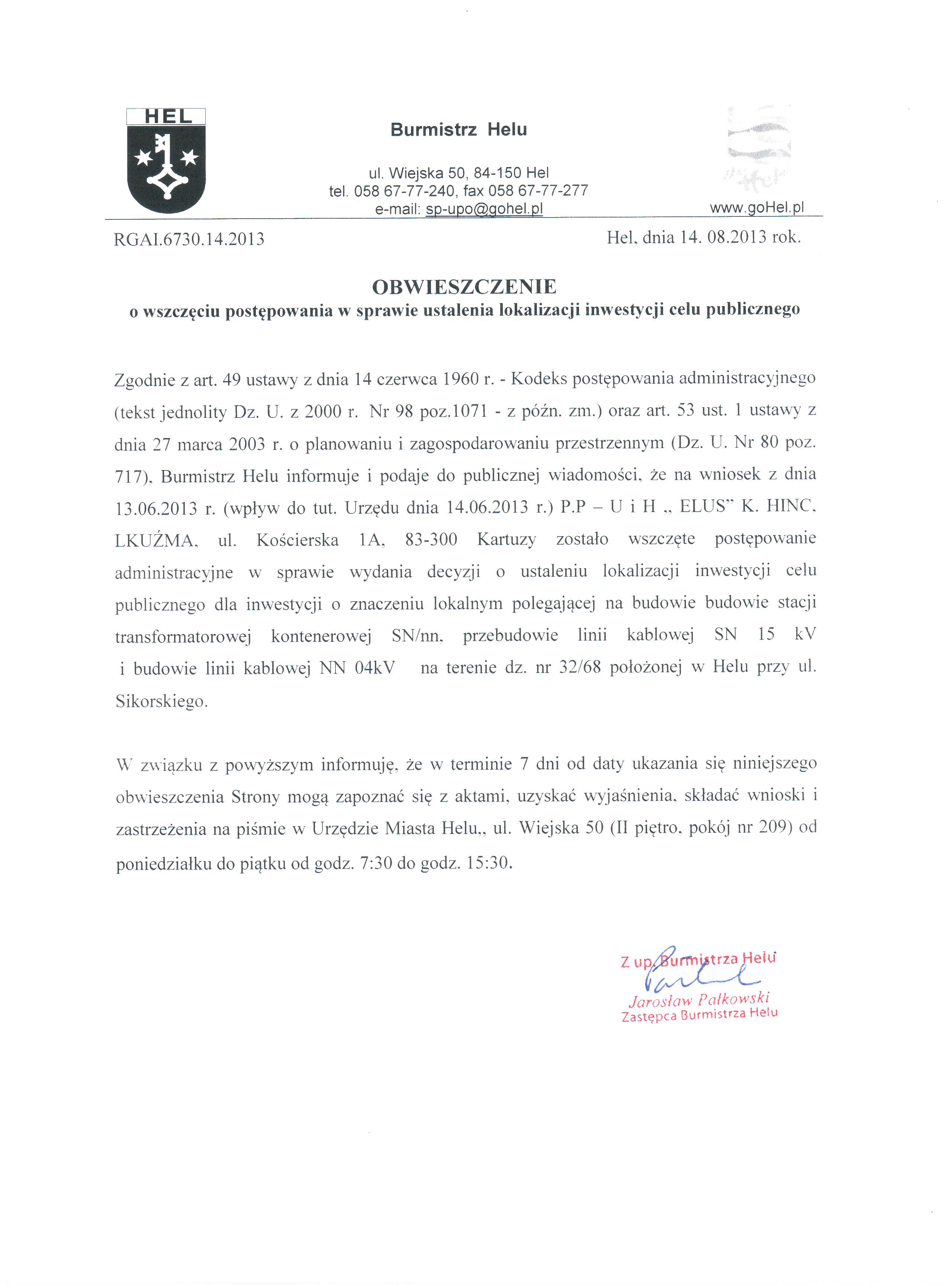 Obwieszczenie burmistrza Helu o wszczęciu postępowania w sprawie ustalenia lokalizacji inwestycji celu publicznego.