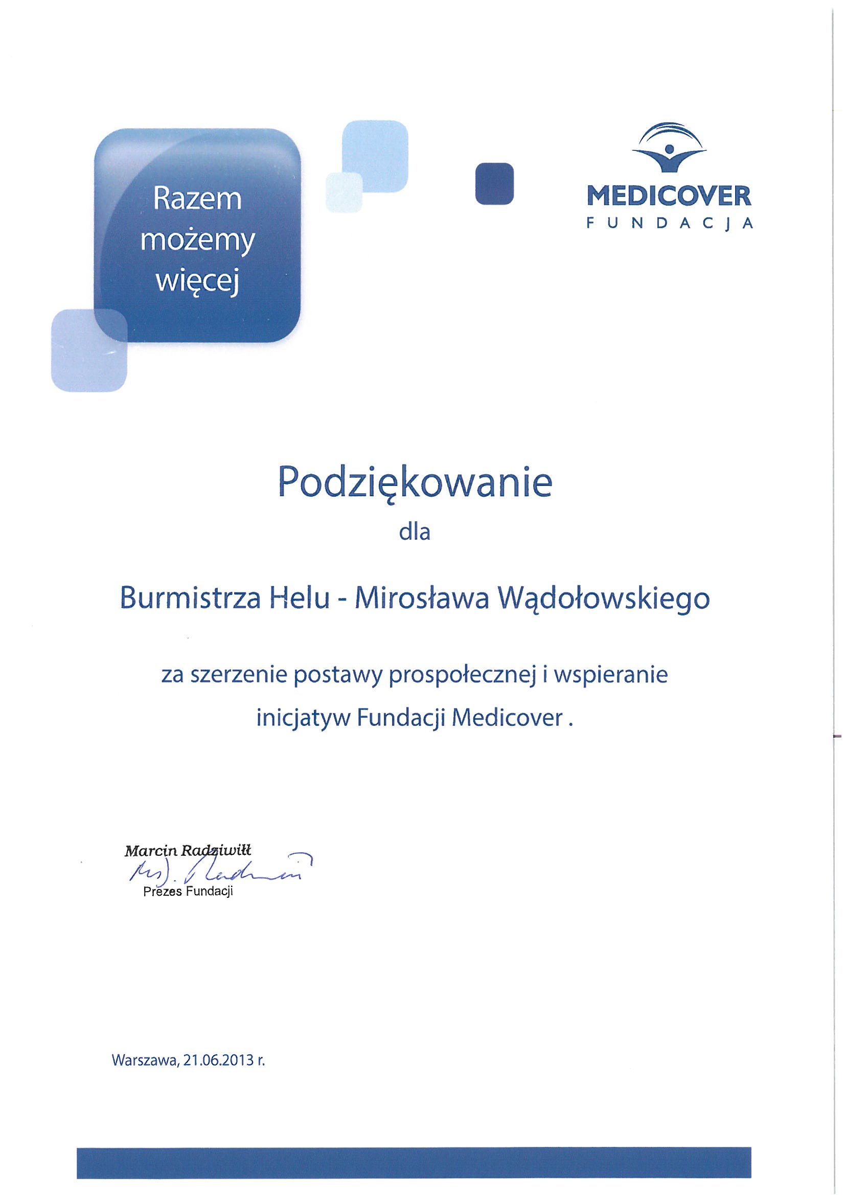 Burmistrz Helu - Mirosław Wądołowski otrzymał podziękowanie od Fundacji MEDICOVER, za szerzenie postawy prospołecznej i wspieranie inicjatyw Fundacji Medicover.