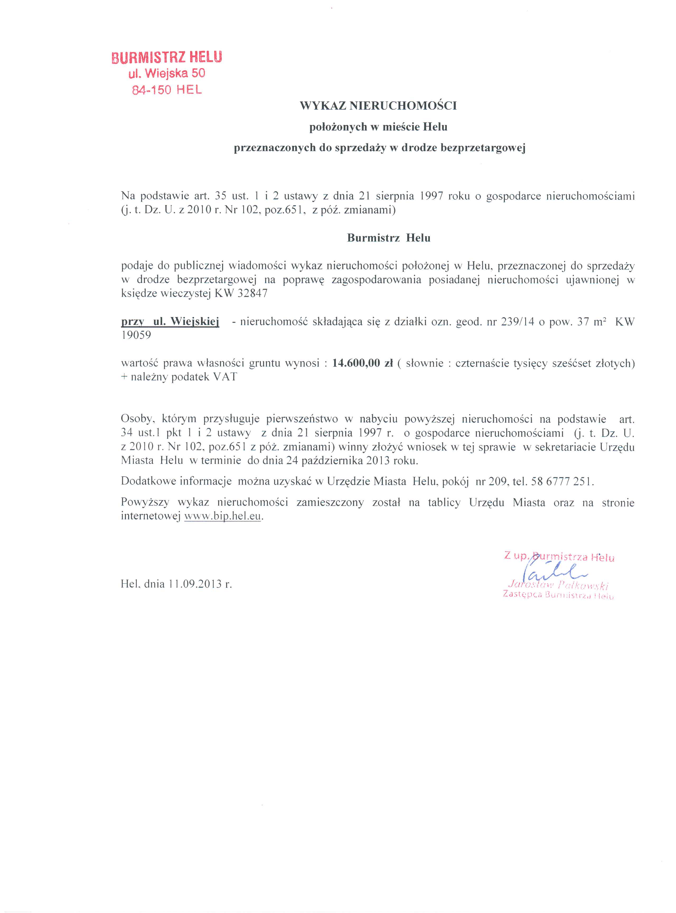 Wykaz nieruchomości położonych w mieście Helu przeznaczonych do sprzedaży w drodze bezprzetargowej.