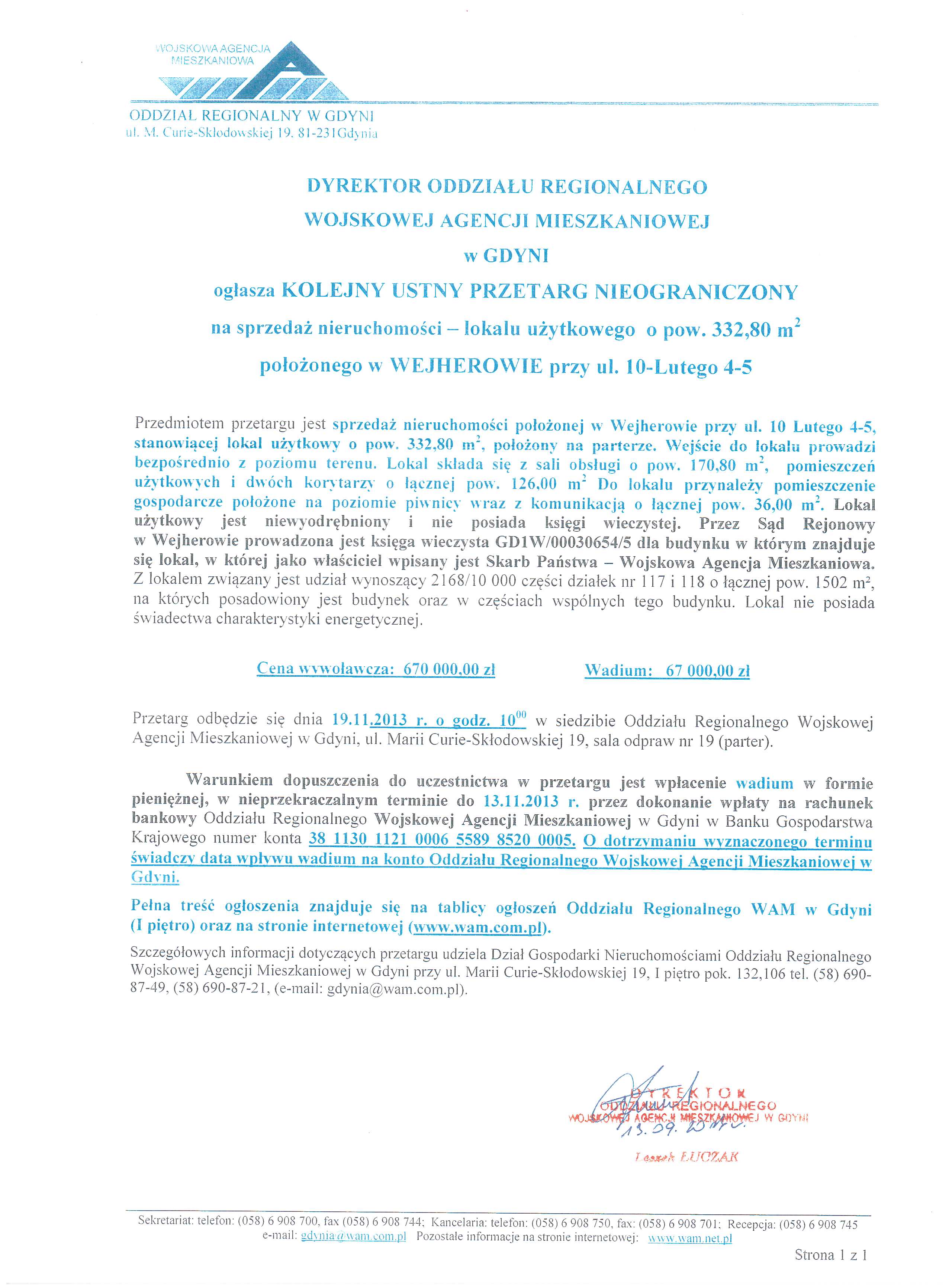 Ogłoszenie Dyrektora WAM O. w Gdyni o przetargu nieograniczonym na sprzedaż nieruchomości położonej w Wejherowie.