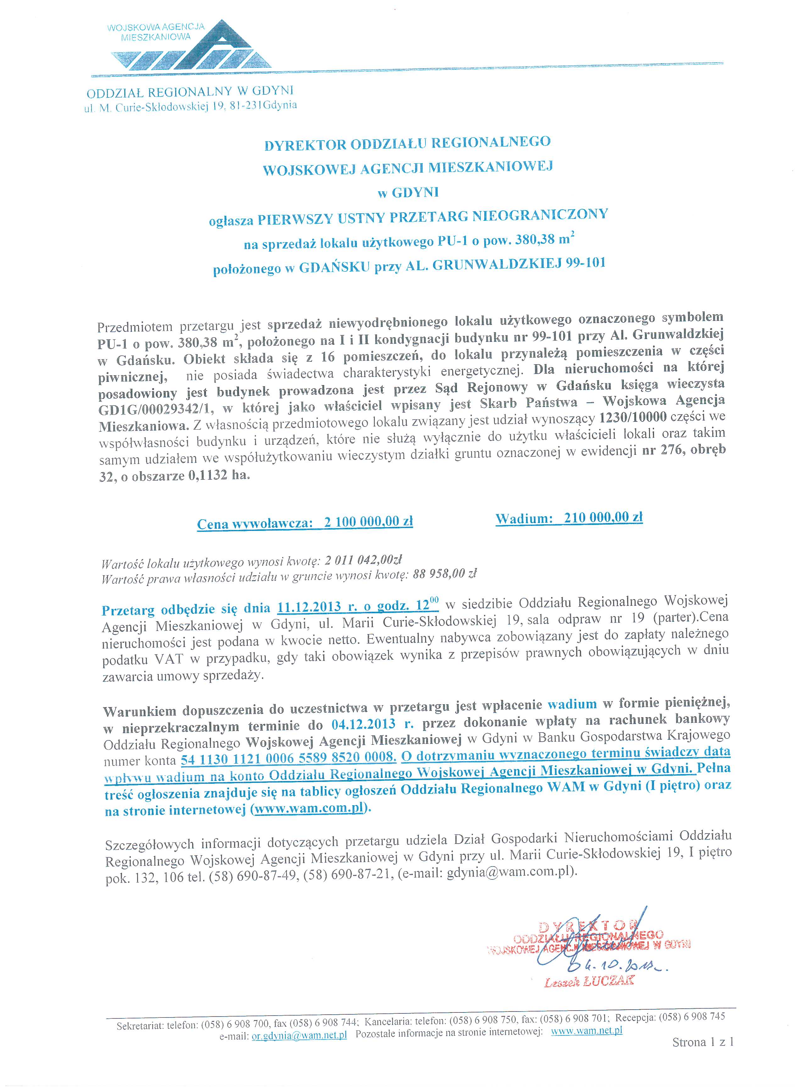 Ogłoszenie Dyrektora Oddziału Regionalnego WAM w Gdyni o ustnym przetargu nieograniczonym na sprzedaż lokalu użytkowego położonego w Gdańsku.
