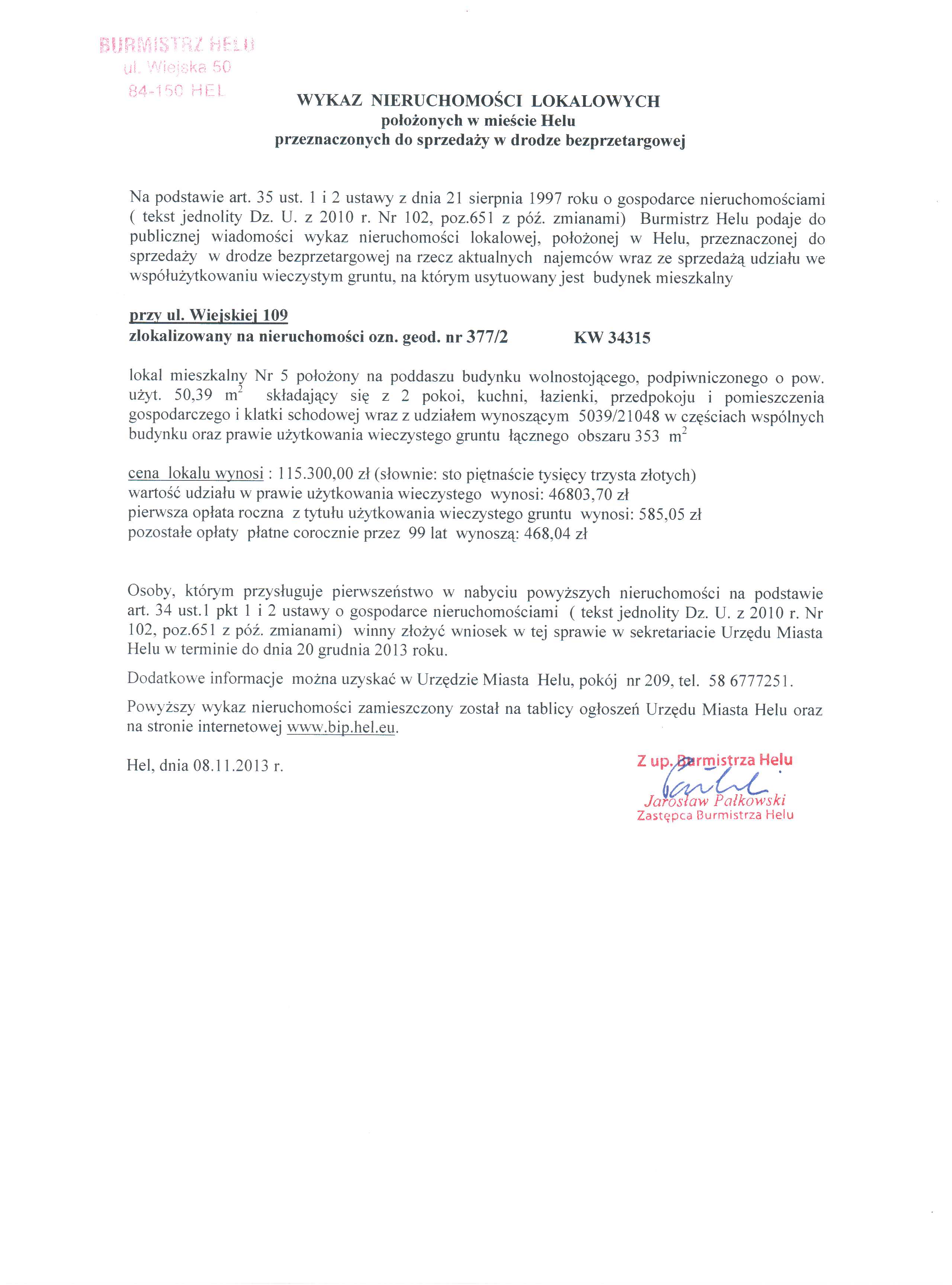 Wykaz nieruchomości położonych w mieście Helu przeznaczonych do sprzedaży w drodze bezprzetargowej.