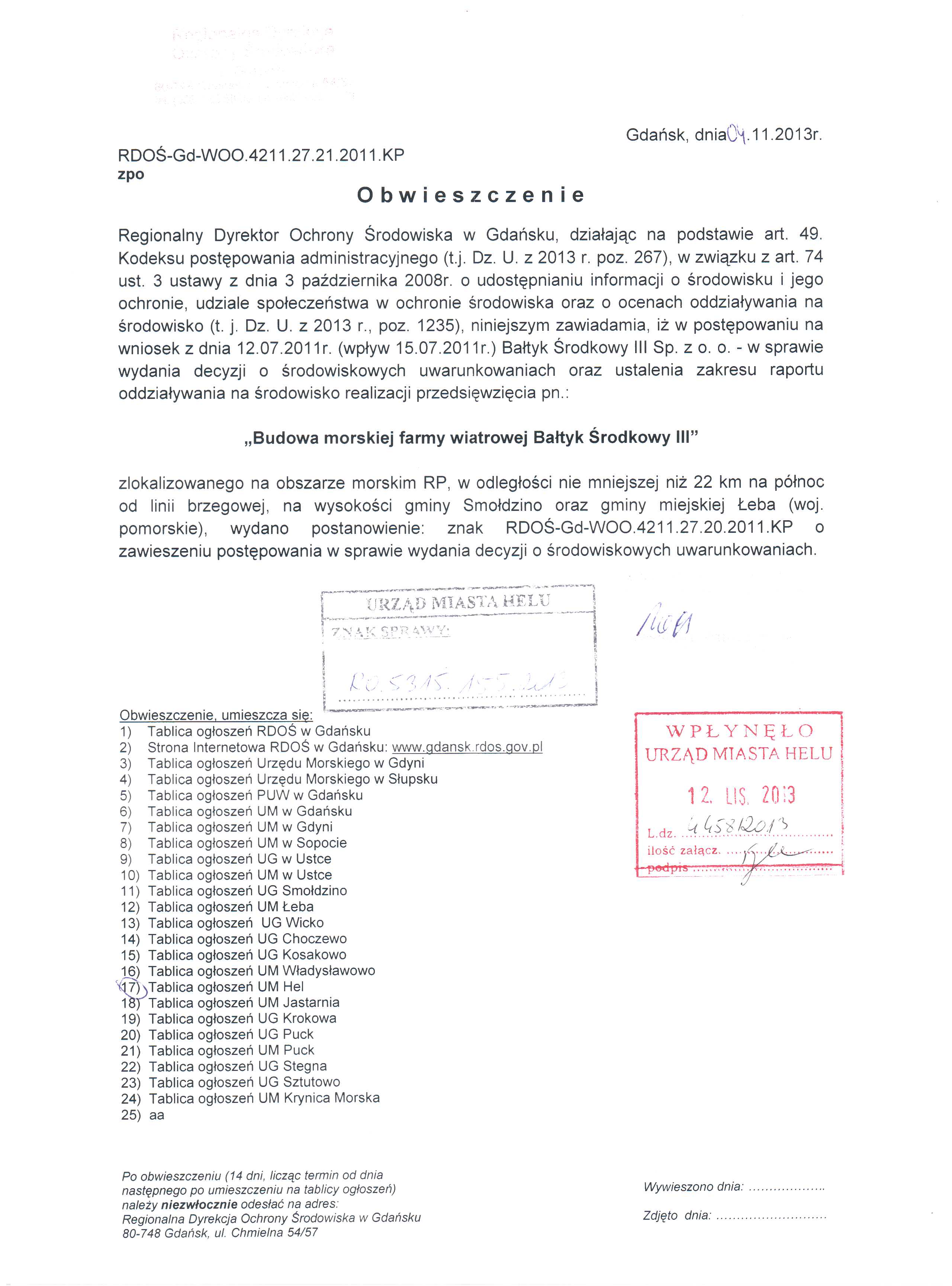 Obwieszczenie Regionalnego Dyrektora Ochrony Środowiska w Gdańsku w sprawie wydania decyzji o środowiskowych uwarunkowaniach oraz ustalenia zakresu raportu oddziaływania na środowisko realizacji przedsięwzięcia pn.: "Budowa morskiej farmy wiatrowej Bałtyk Środkowy III"
