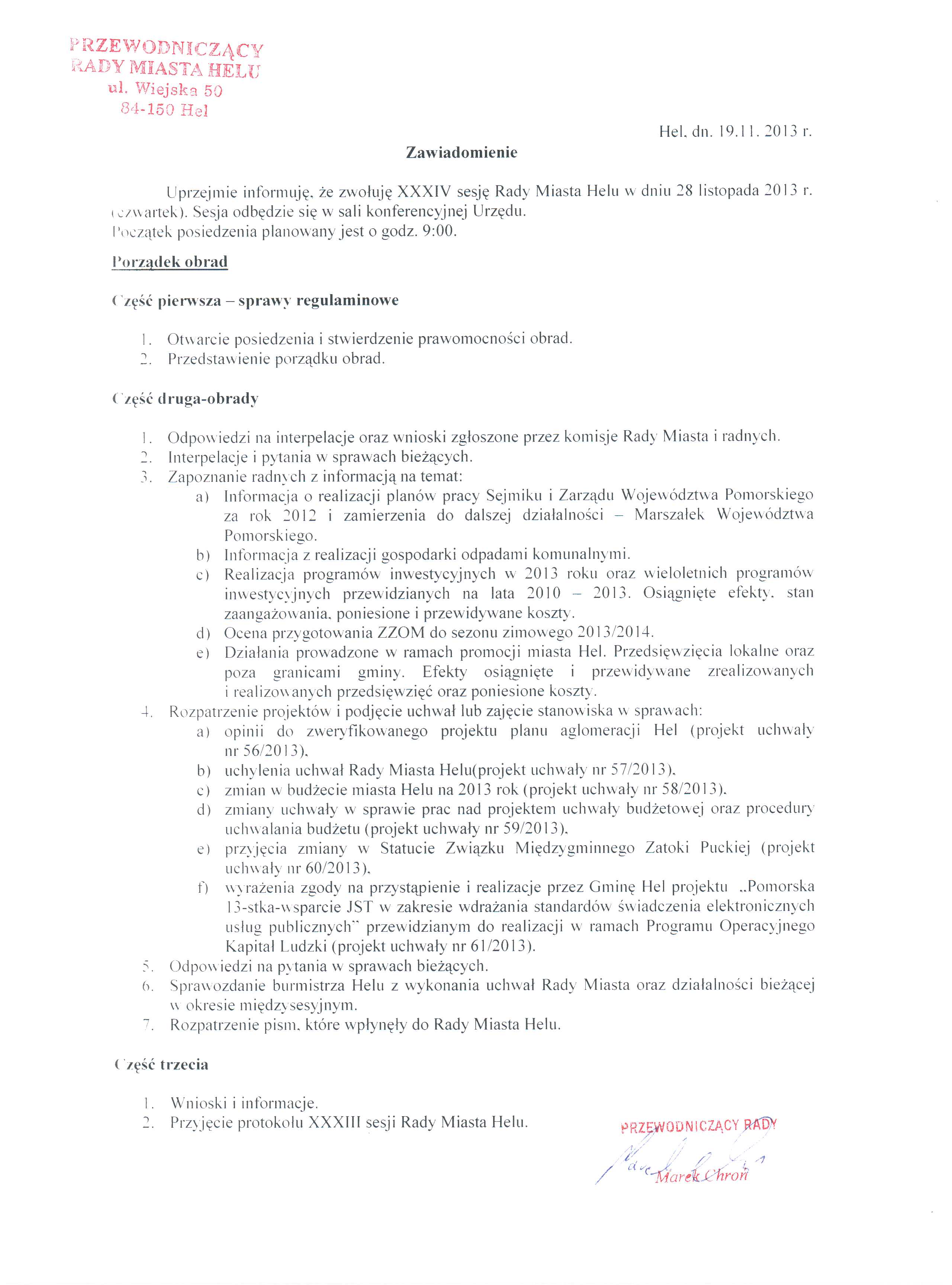 Zawiadomienie o terminie XXXIV sesji Rady Miasta Helu.