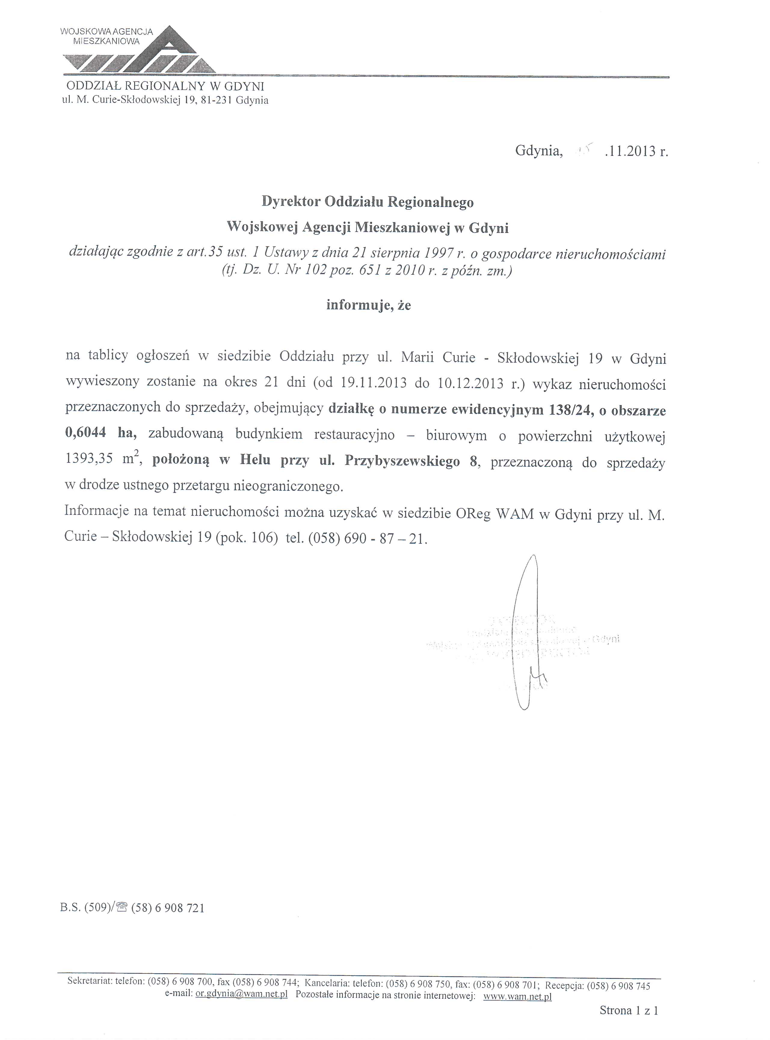W linku do pobrania znajduje się informacja Dyrektora Oddziału Regionalnego WAM w Gdyni o wywieszeniu wykazu nieruchomości przeznaczonych do sprzedaży w drodze przetargu.