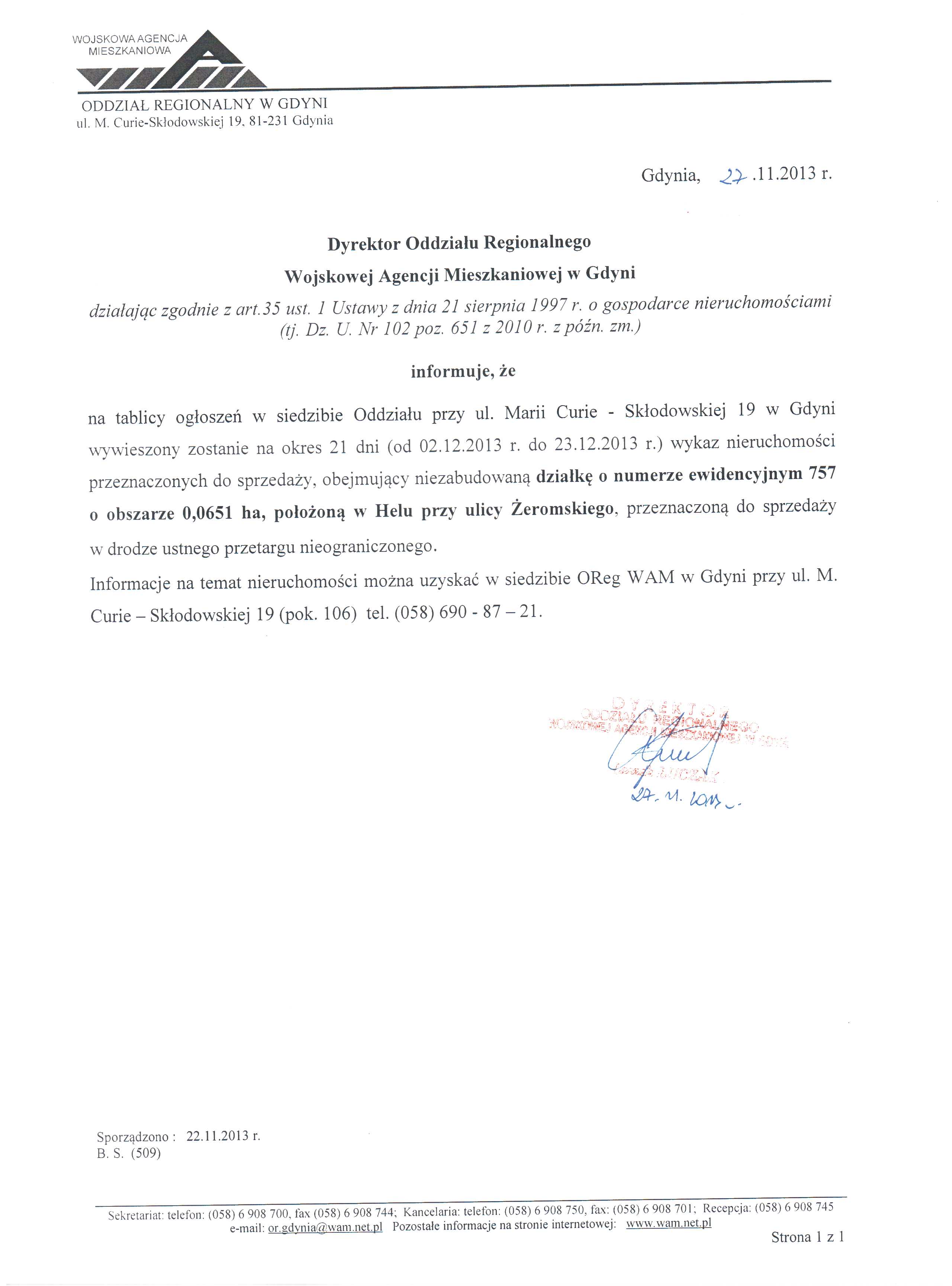 Informacja WAM Oddział Regionalny w Gdyni o wywieszeniu wykazu nieruchomości w Helu przeznaczonej do sprzedaży w drodze przetargu ustnego.
