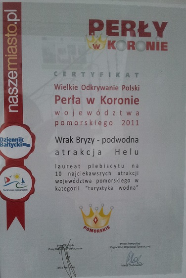 2011 rok - Certefikat Wielkie Odkrywanie Polski Perła w Koronie - Wrak Bryza - podwodna atrakcja Helu