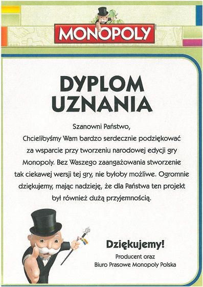 2011.04.28 - Dyplom uznania za wsparcie przy tworzeniu narodowej edycji gry Monopoly