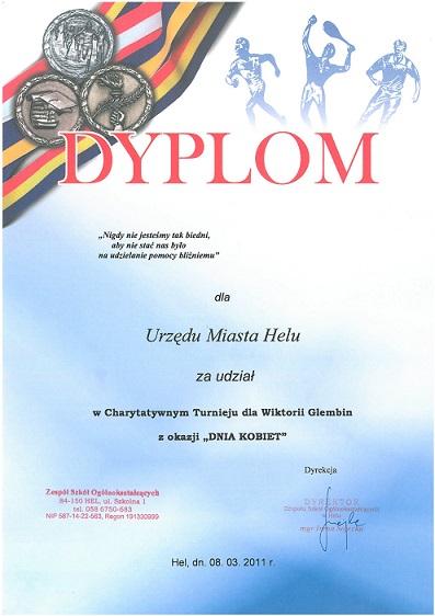 2011.03.08 - Dyplom za udział w Charytatywnym Turnieju dla Wiktorii Glembin z okazji "Dnia Kobiet"