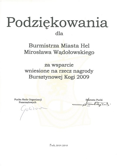 2010.01.28 - Podziękowanie za wsparcie wniesione na rzecz nagrody Bursztynowej Kogi