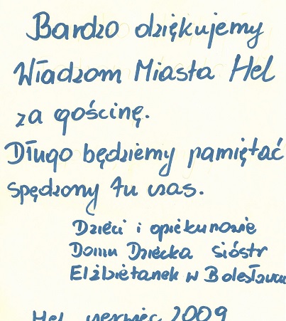 2009 czerwiec - Podziękowanie od Dzieci i Opiekunów Domu Dziecka Sióstr Elżbietanek w Bolesławcu za gościnę
