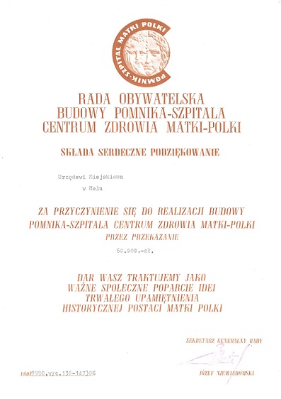 1990 wrzesień - Podziękowanie za przyczynienie się do realizacji budowy pomnika-szpitala Centrum Zdrowia Matki-Polki
