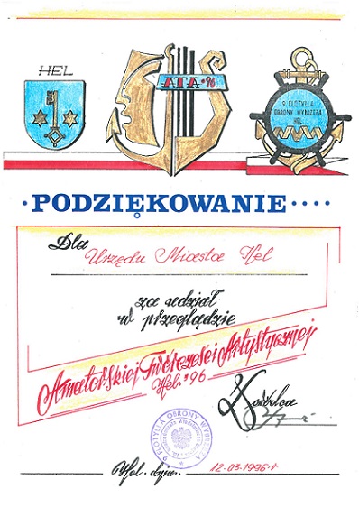 1996.03.12 - Podziękowanie za udział w przeglądzie Amatorskiej Twórczości Artystycznej
