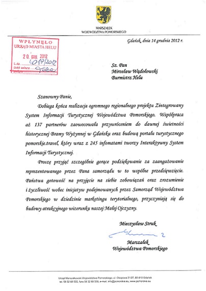 2012.12.14 - Podziękowanie za zaangażowanie w projekt Zintegrowanego Systemu Informacji Turystycznej Województwa Pomorskiego