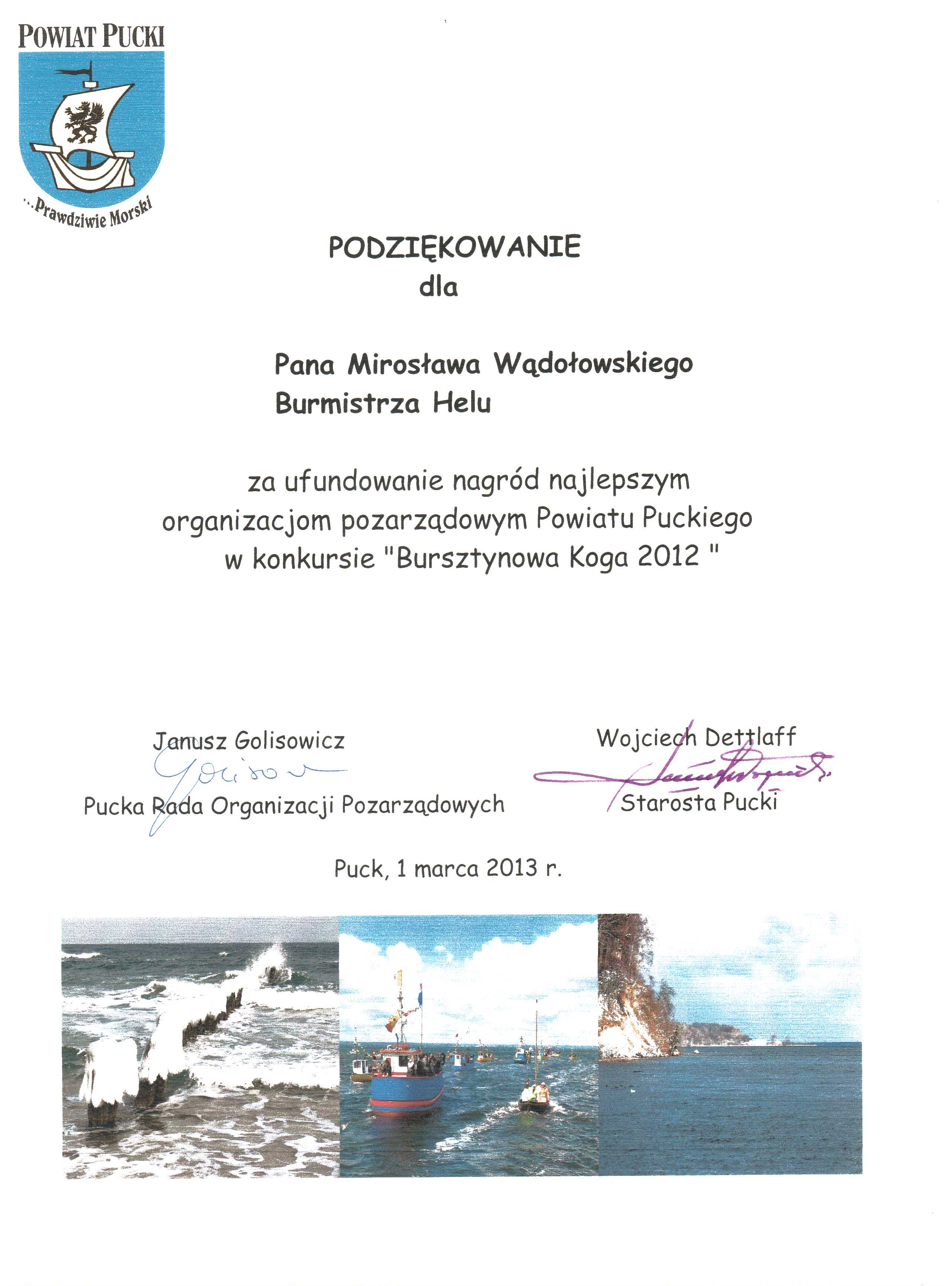 2013.03.01 Podziękowanie za ufundowanie nagród najlepszym organizacjom pozarządowym Powiatu Puckiego w konkursie