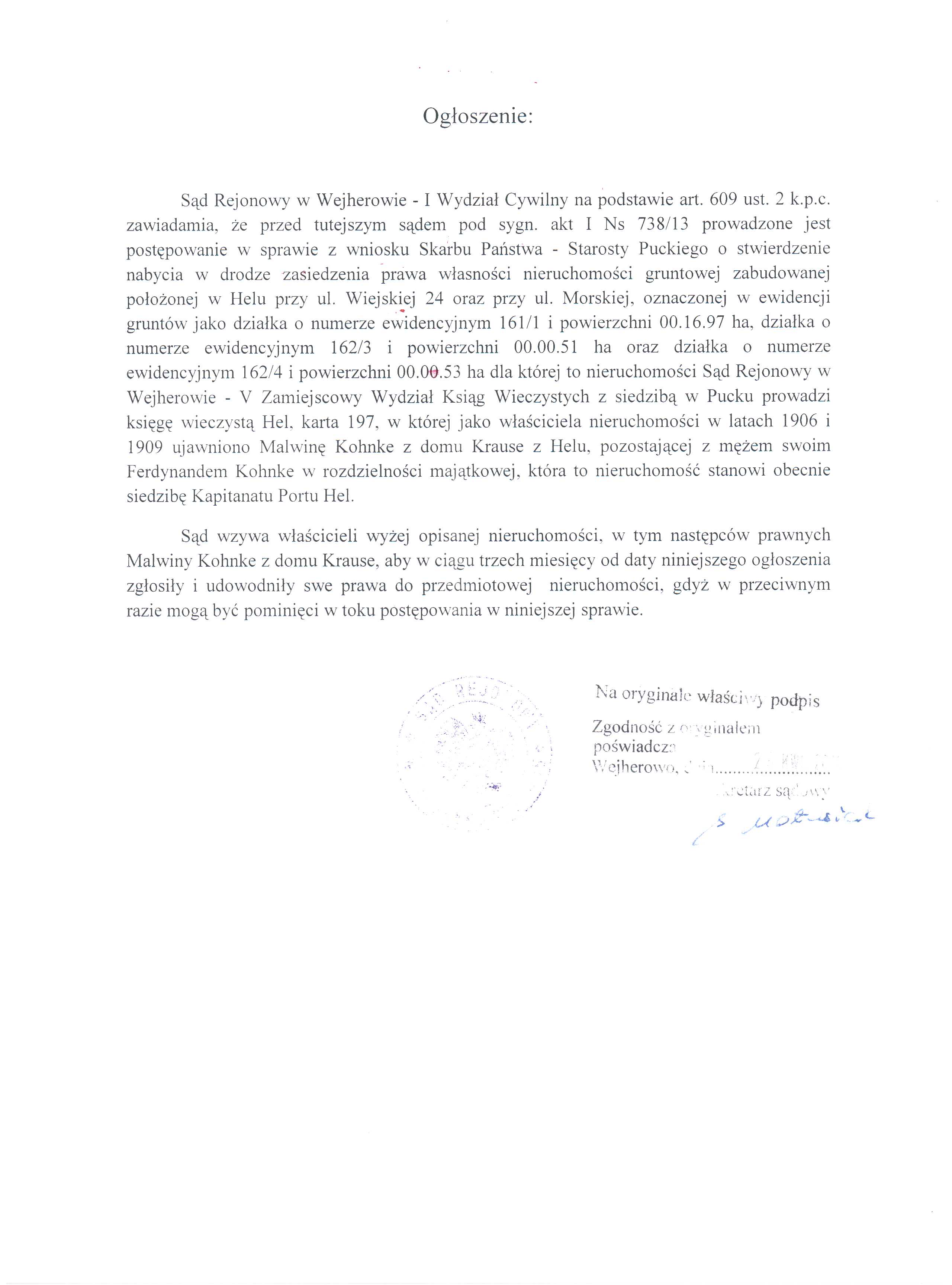 W linku do pobrania znajduje się ogłoszenie Sądu Rejonowego w Wejherowie - I Wydział Cywilny o prowadzonym postępowaniu w sprawie z wniosku Skarbu Państwa - Starosty puckiego o stwierdzenie nabycia w drodze zasiedzenia prawa własności nieruchomości gruntowej zabudowanej, położonej w Helu.