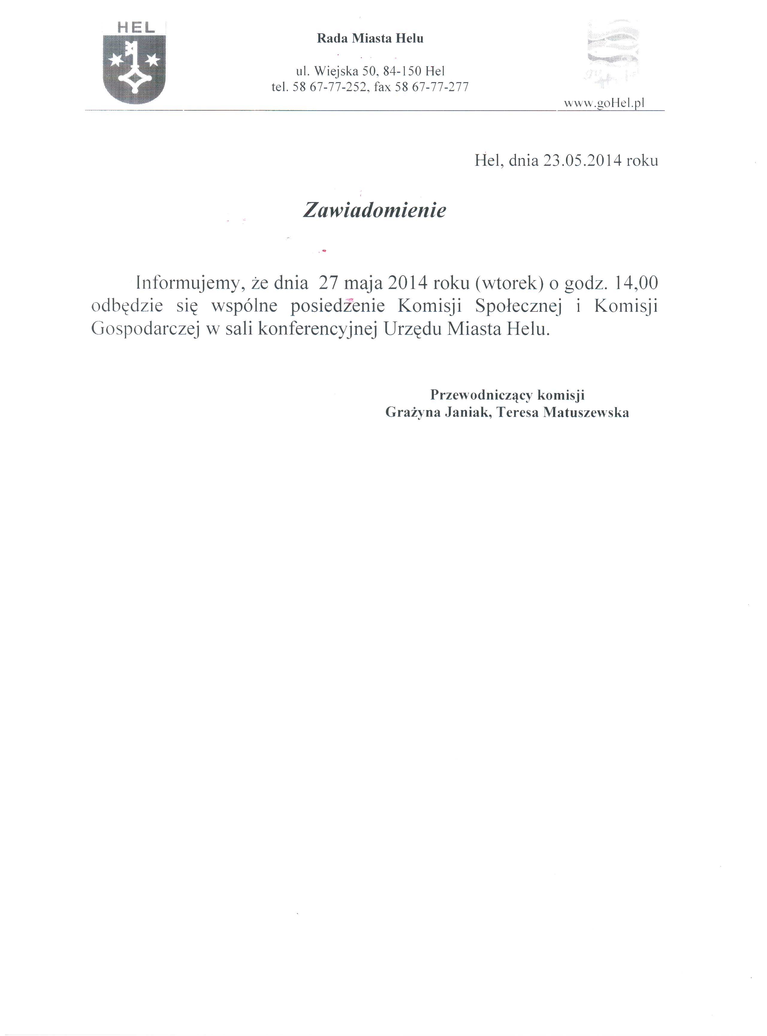 W linku do pobrania znajduje się zawiadomienie o terminie posiedzenia Komisji Spolecznej i Gospodarczej Rady Miasta Helu.