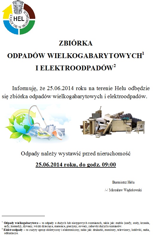 Informuję, że 25.06.2014 roku na terenie Helu odbędzie się zbiórka odpadów wielkogabarytowych i elektroodpadów.
