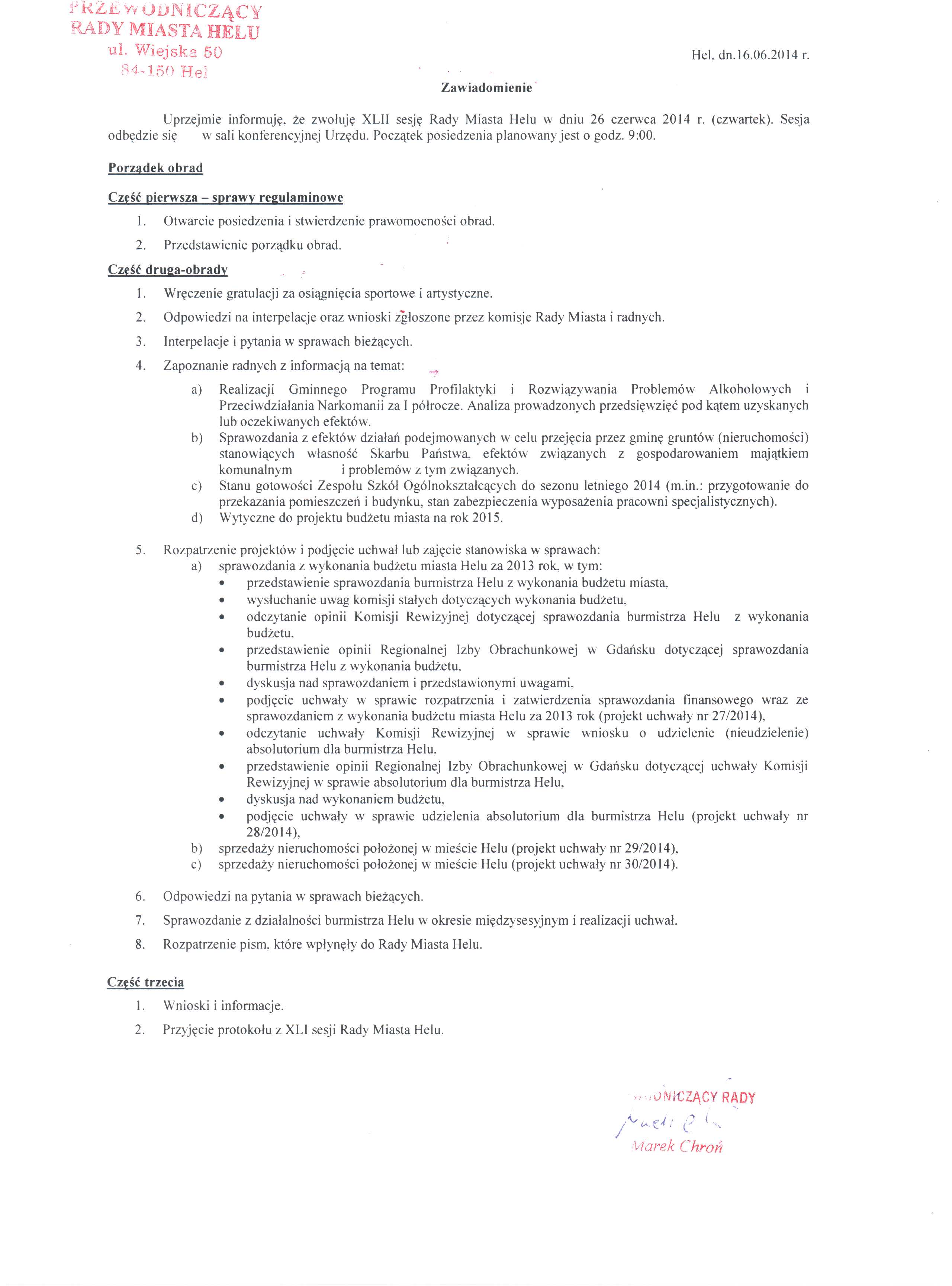 Zawiadomienie o terminie XLII sesji Rady Miasta Helu.