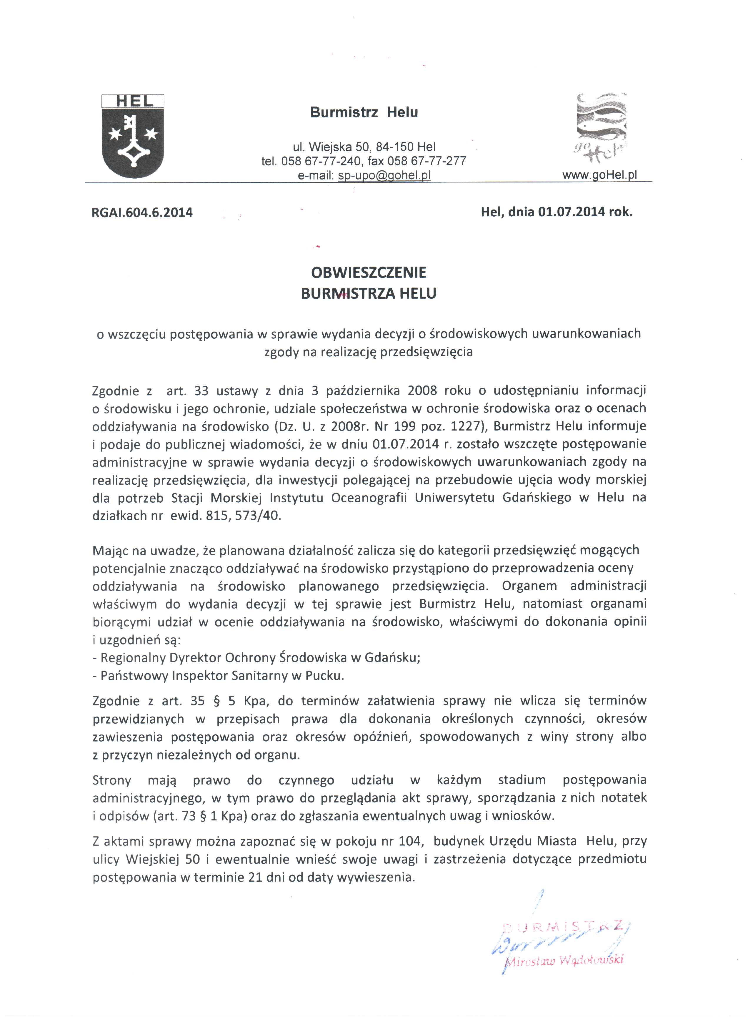 W linku do pobrania znajduje się obwieszczenie burmistrza Heluw o wszczęciu postępowania w sprawie decyzji o środowiskowych uwarunkowaniach zgody na realizację przedsięwzięcia dla inwestycji polegającej na przebudowie ujęcia wody morskiej dla potrzeb Stacji Morskiej Instytutu Oceanografii U G w Helu na dzialkach nr ewid. 815, 573/40.