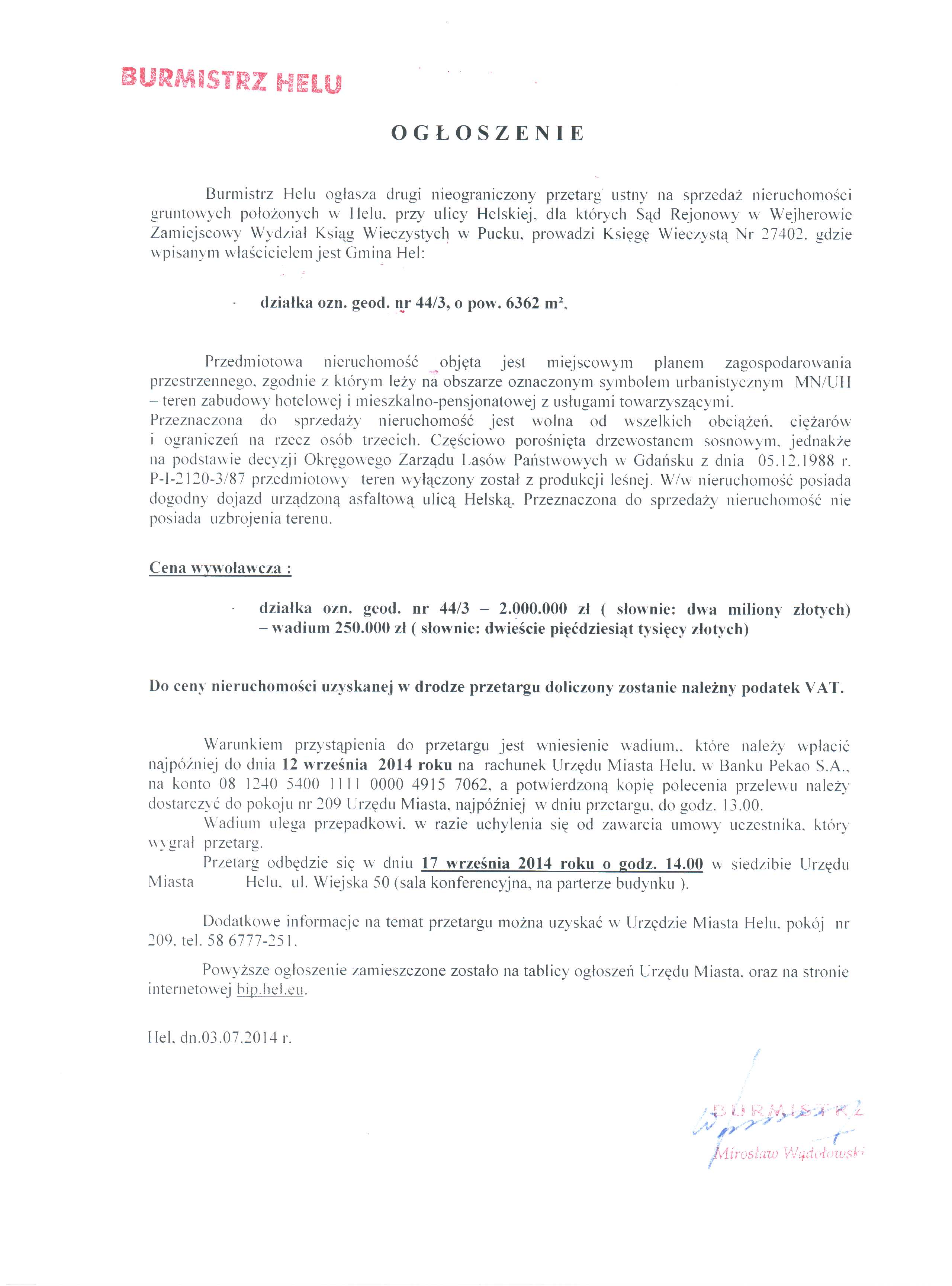 W linku do pobrania znajduje się ogłoszenie burmistrza Helu o drugim nieograniczonym przetargu ustnym na sprzedaż nieruchomości gruntowej polożonej w m. Helu.