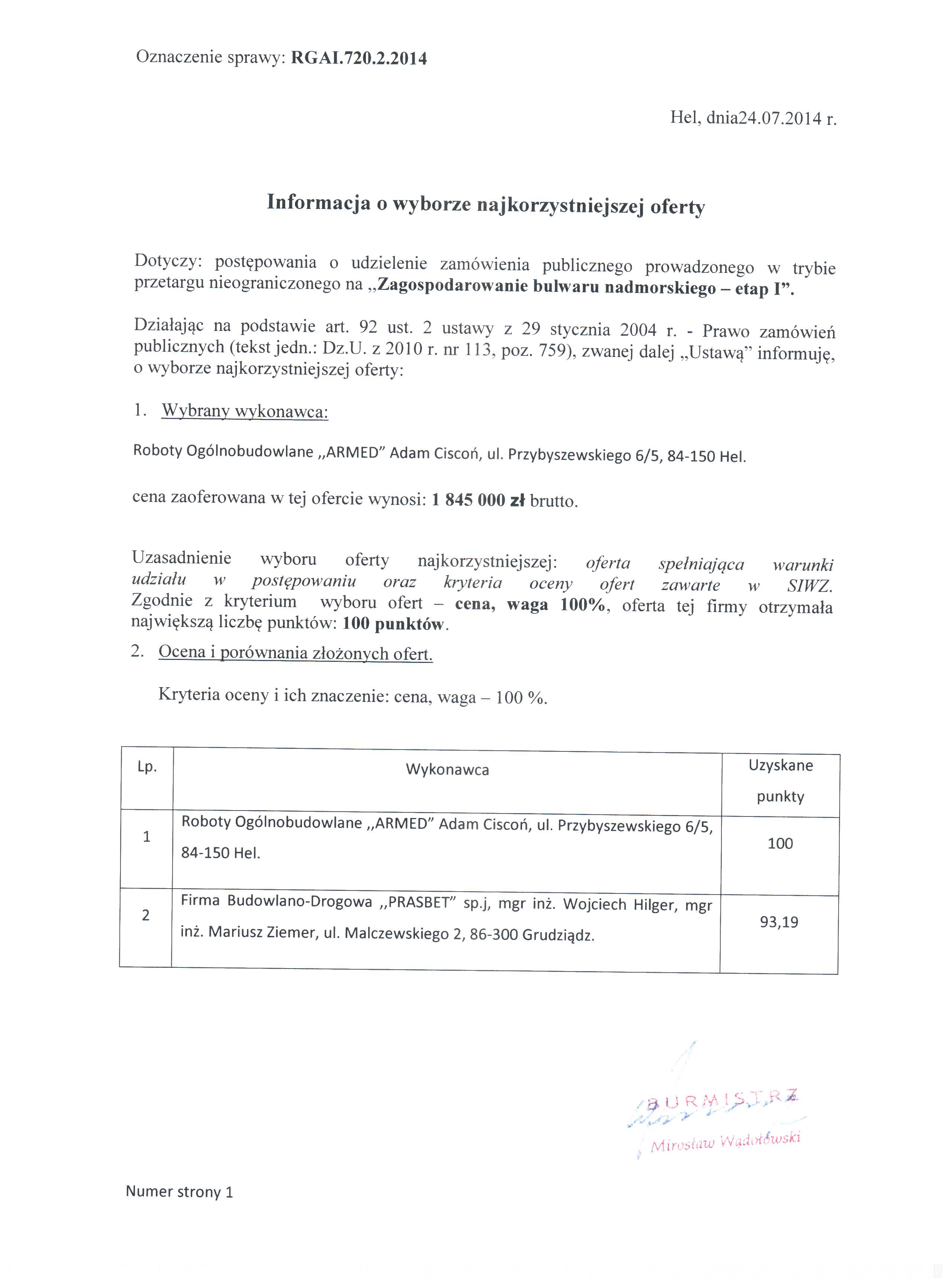 W linku do pobrania znajduje się informacja burmistrza Helu o wyborze o wyborze najkorzystniejszej oferty dot. postępowania oudzielenie zamówienia publicznego prowadzonego w trybie przetargu nieograniczonego na "Zagospodarowanie bulwaru nadmorskiego- etap I"