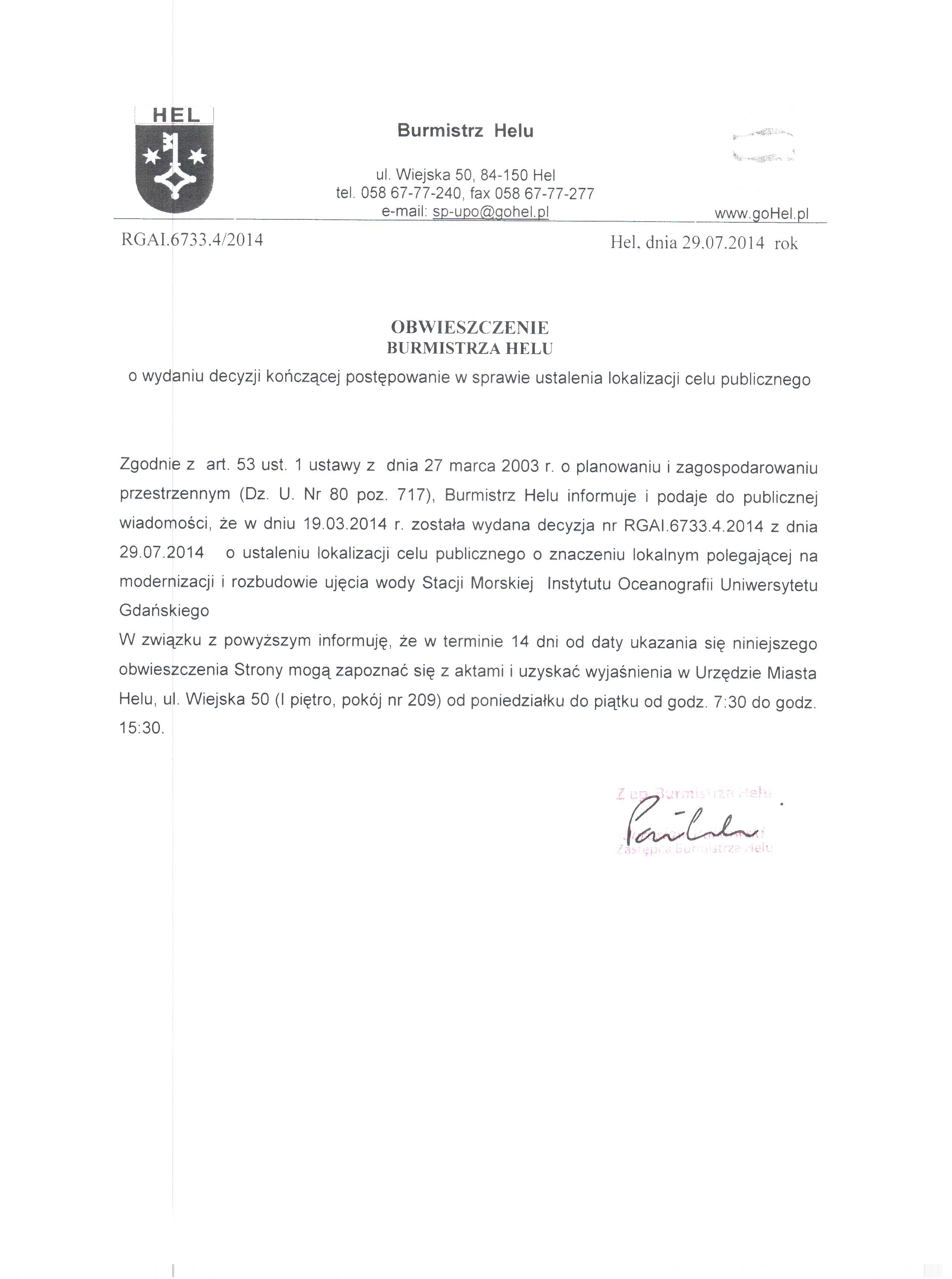 W linku do pobrania znajduje się obwieszczenie burmistrza Helu o wydaniu decyzji kończącej postępowanie w sprawie ustalenia lokalizacji celu publicznego o znaczeniu lokalnym polegającej na modernizacji i rozbudowie ujęcia wody Stacji Morskiej Instytutu Oceanografii UG.