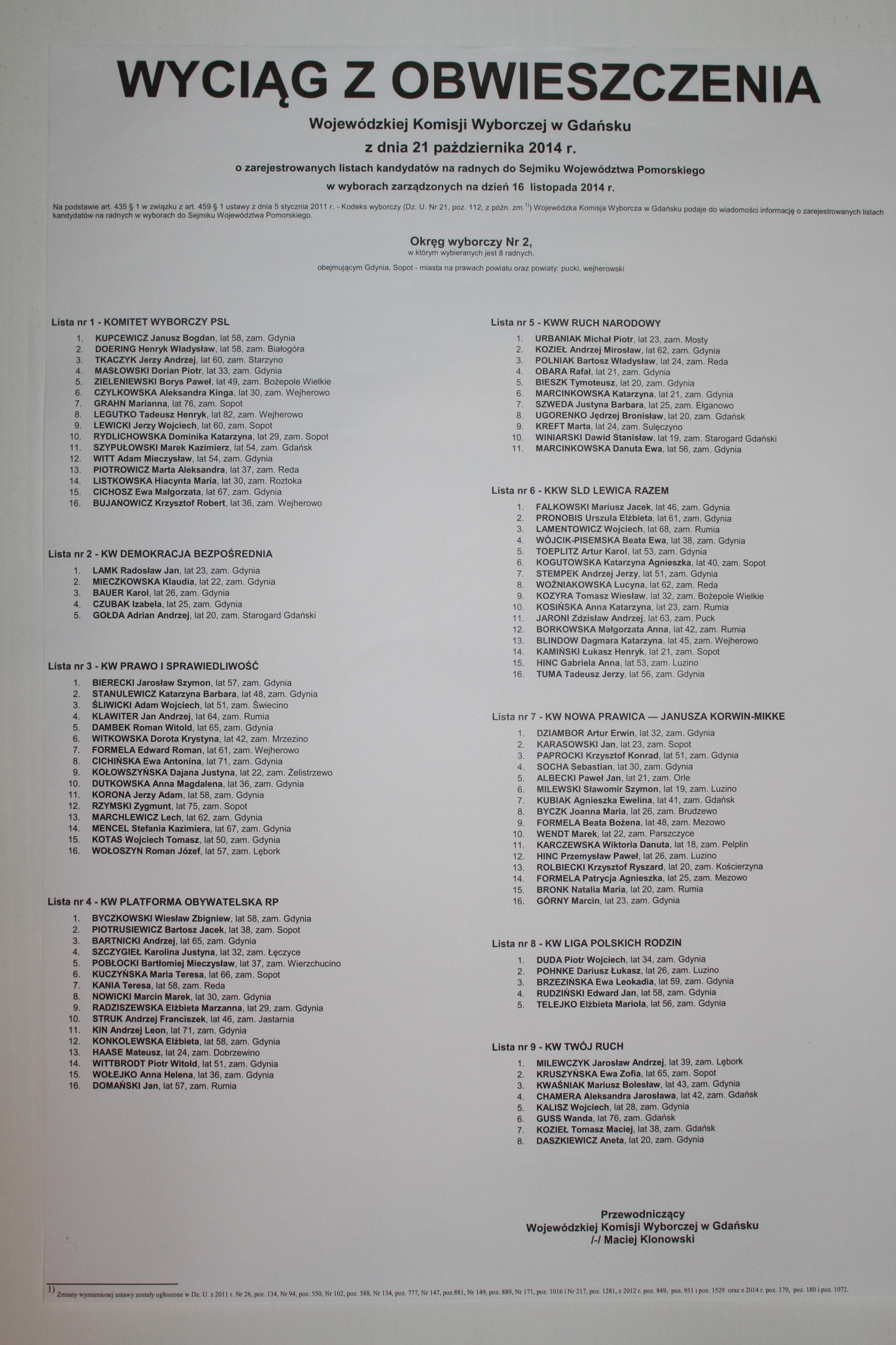 Wyciąg z Obwieszczenia Wojewódzkiej Komisji Wyborczej w Gdańsku z dnia 21.10.2014 o zarejestrowanych listach kandydatów na radnych do Sejmiku Województwa Pomorskiego - okręg wyborczy nr 2