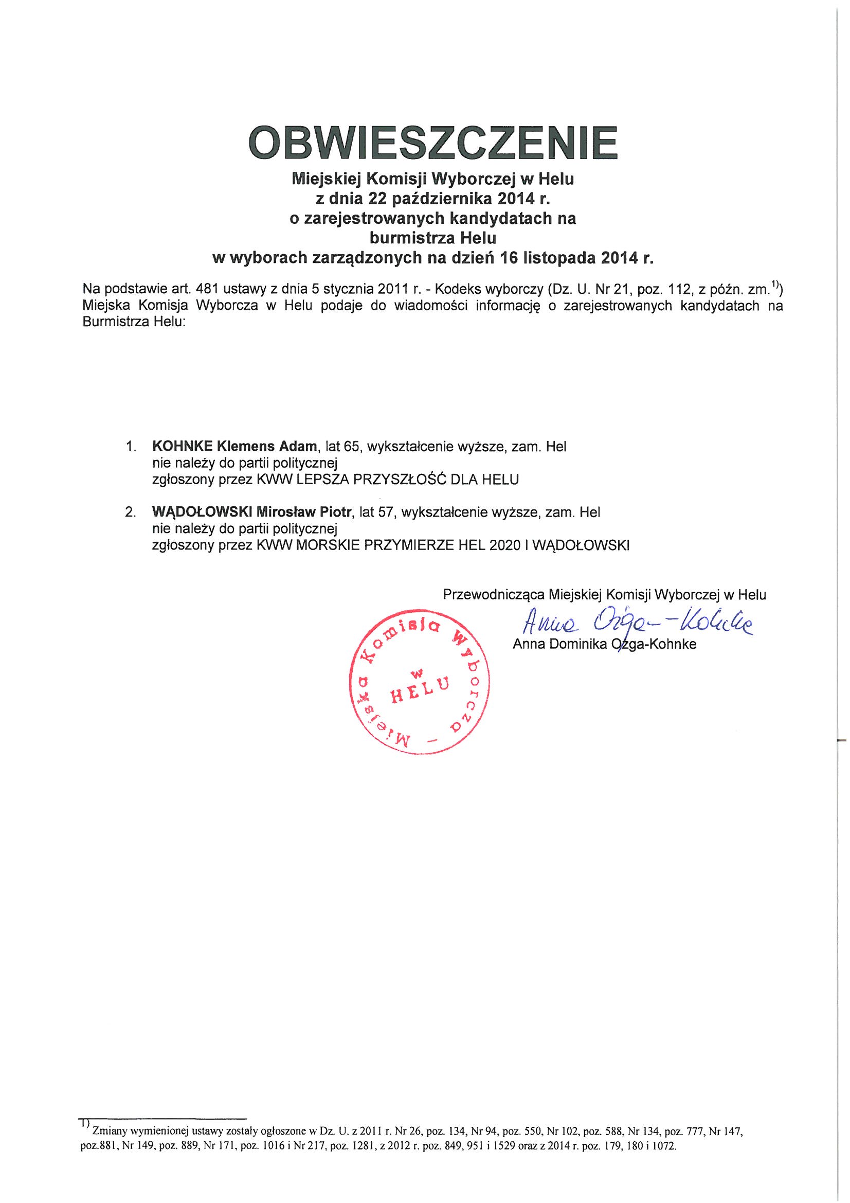 Na podstawie art. 481 ustawy z dnia 5 stycznia 2011 r. - Kodeks wyborczy (Dz. U. Nr 21, poz. 112, z późn. zm.1)) Miejska Komisja Wyborcza w Helu podaje do wiadomości informację o zarejestrowanych kandydatach na Burmistrza Helu: