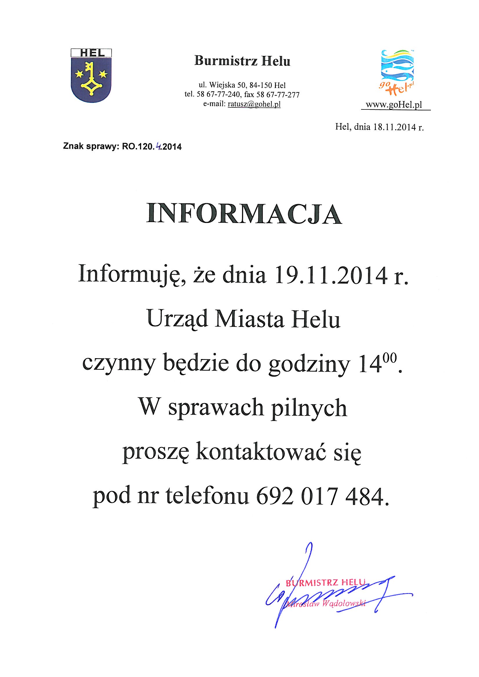 19.11.2014 r. Urząd Miasta Helu czynny będzie do godz. 14:00.