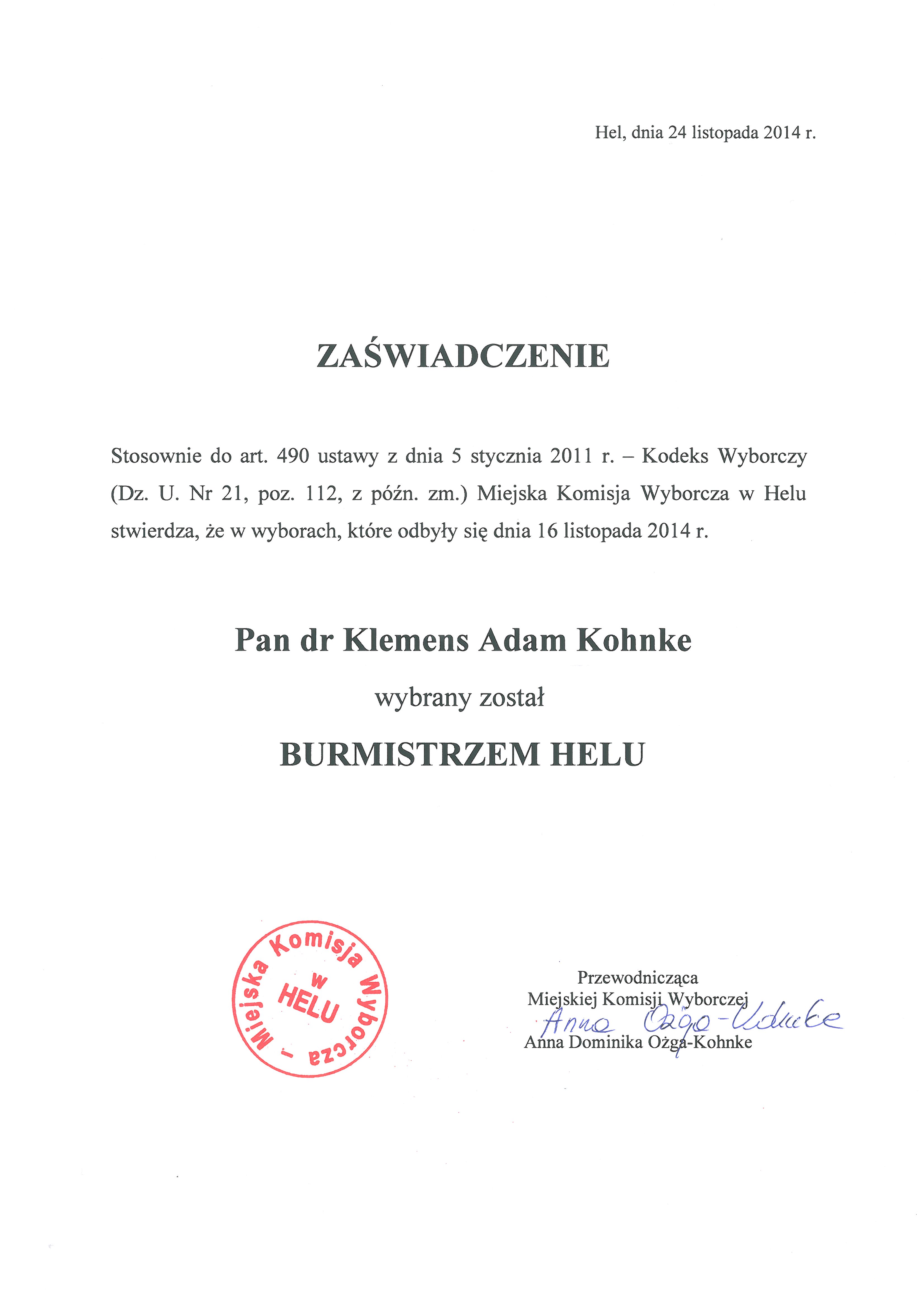 | 1 | zaświadczenie o wyborze na Burmistrza Helu - Dr Klemens Adam Kohnke.jpg (JPG, 50KB) | 2015-02-28 11:06:41 | 757 razy |