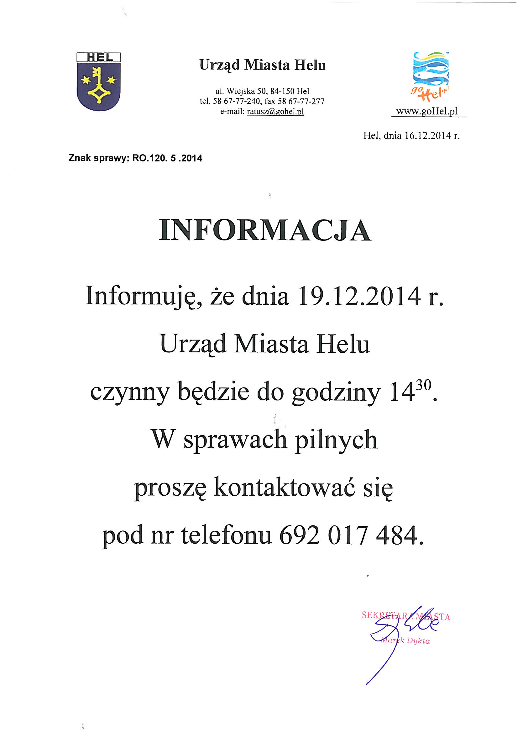 19.12.2014 r. Urząd Miasta Helu czynny będzie do godz. 14:30.