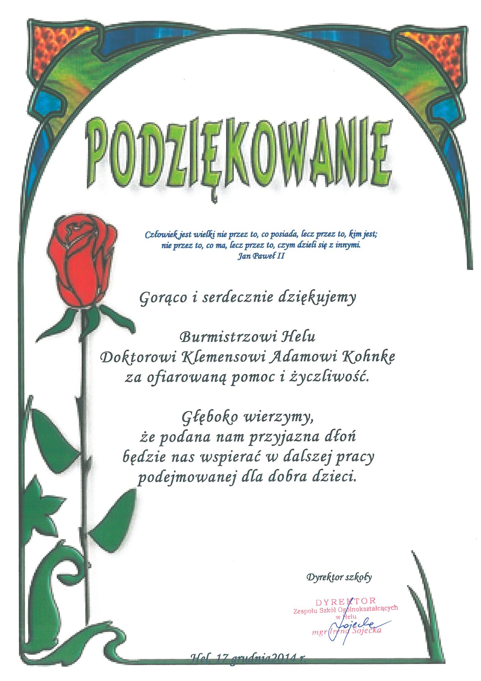 2014.12.17 - Podziękowanie za ofiarowaną pomoc i życzliwość
