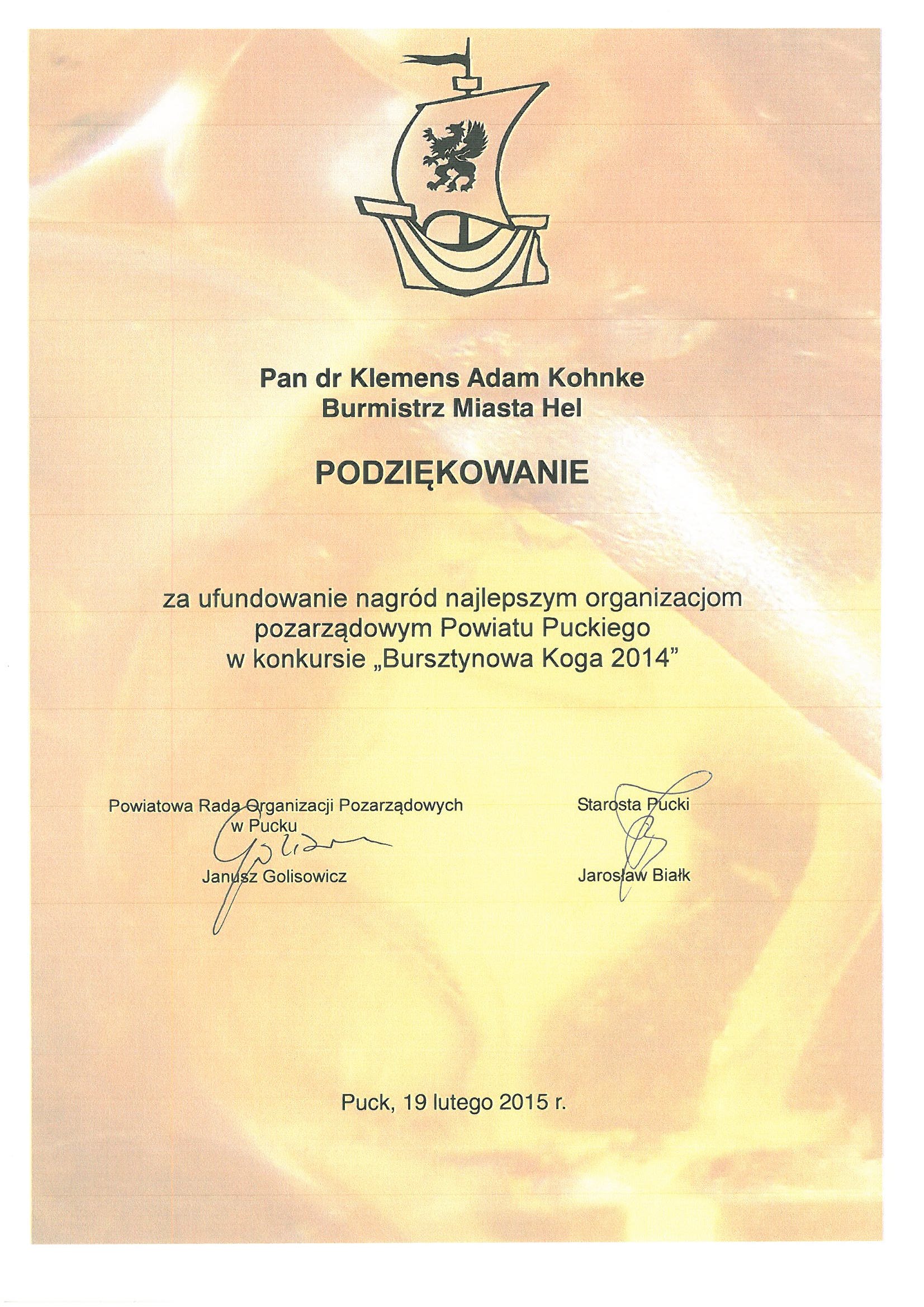 Podziękowanie dla Burmistrza Helu Dr Klemensa Adama Kohnke za ufundowanie nagród najlepszym organizacjom pozarządowym Powiatu Puckiego w konkursie "Bursztynowa Koga 2014".