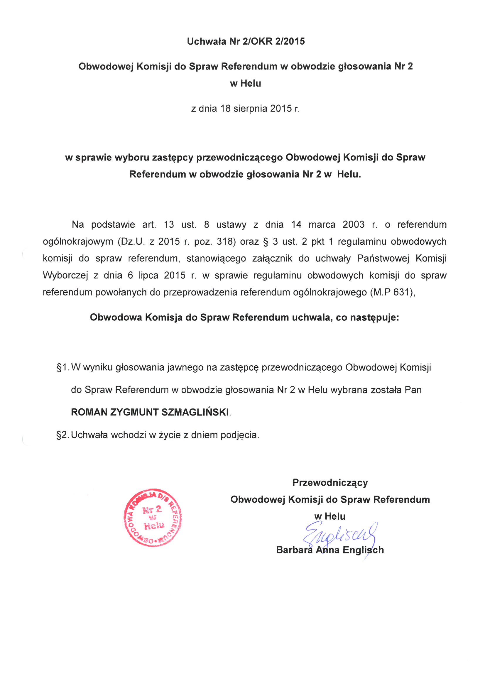 Uchwała Nr 2/OKR 2/2015 Obwodowej Komisji do Spraw Referendum w obwodzie głosowania Nr 2 w Helu w sprawie wyboru zastępcy przewodniczącego Obwodowej Komisji do Spraw Referendum w obwodzie głosowania Nr 2 w Helu.