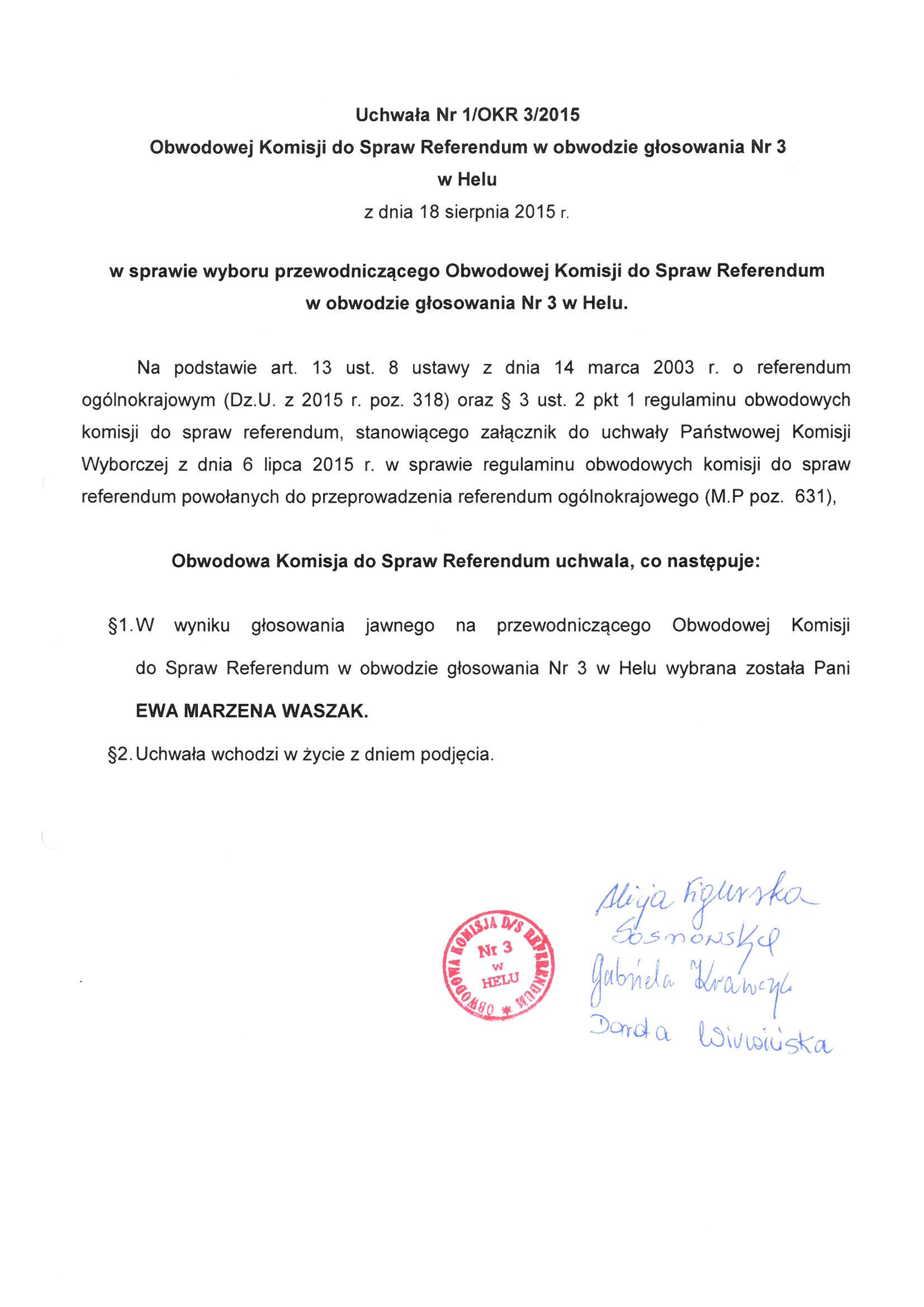 Uchwała Nr 1/OKR 3/2015 Obwodowej Komisji do Spraw Referendum w obwodzie głosowania Nr 3 w Helu w sprawie wyboru przewodniczącego Obwodowej Komisji do Spraw Referendum w obwodzie głosowania Nr 3 w Helu.
