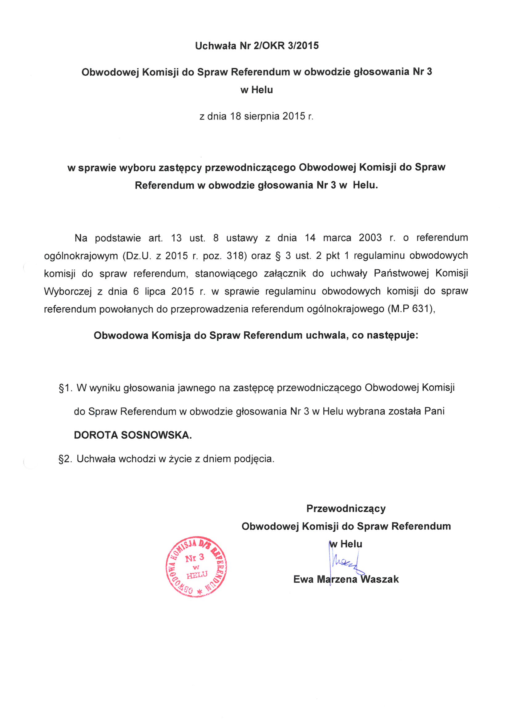 Uchwała Nr 2/OKR 3/2015 Obwodowej Komisji do Spraw Referendum w obwodzie głosowania Nr 3 w Helu w sprawie wyboru zastępcy przewodniczącego Obwodowej Komisji do Spraw Referendum w obwodzie głosowania Nr 3 w Helu.